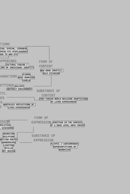 Each of the 3 OBJs should represent a larger over arching geopolitical issue for discussing these hyper specific motifs. (For example, Gas Canister representing Extraction of MENA resources, depleting our lands, etc.) The Overarching theme should have some relation to the architectural discourse, Either the way we think, view, work, or talk about architecture. (Think OMAs Countryside Exhibition + Book, not a architectural building but heavily influential to the architectural discourse.