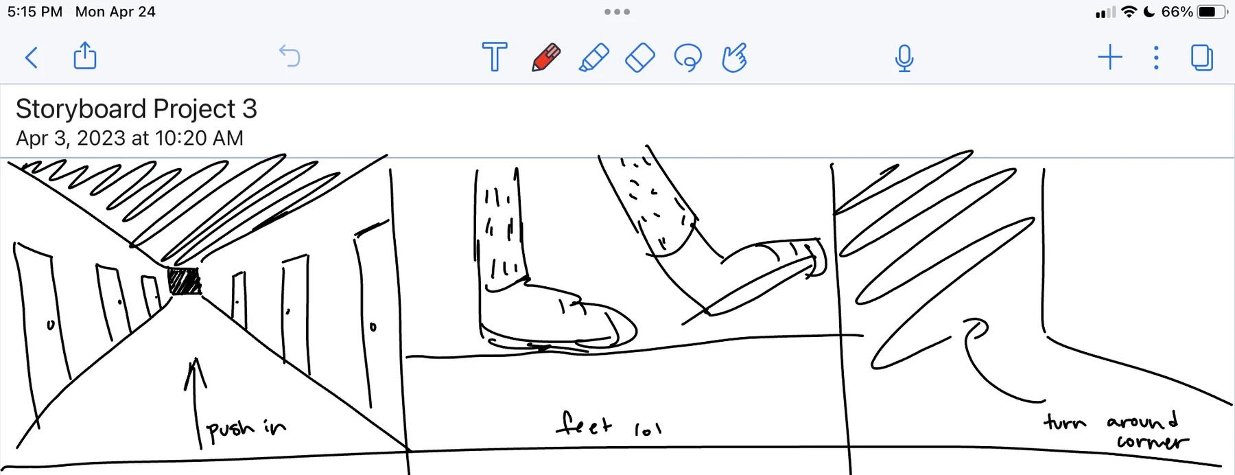 I wanted to communicate the type of shots I wanted to capture to my group members so I made this small storyboard of ideas. I wanted to match a similar energy to the killer stalking his prey in a horror movie, capturing life from that more ominous point of view.