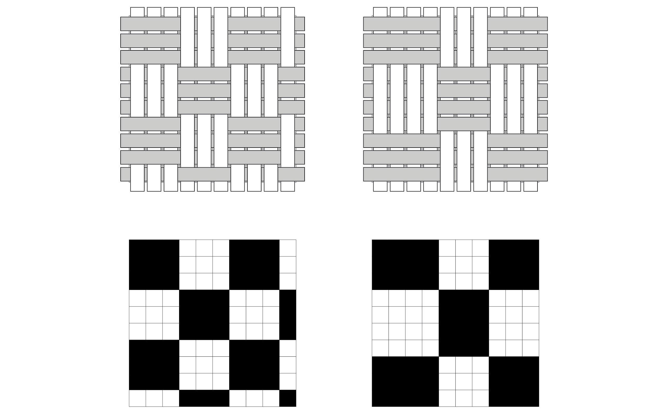# Weaving pattern declaration pattern = [ [1, 0, 1, 0], [0, 1, 0, 1], [1, 0, 1, 0], [0, 1, 0, 1]