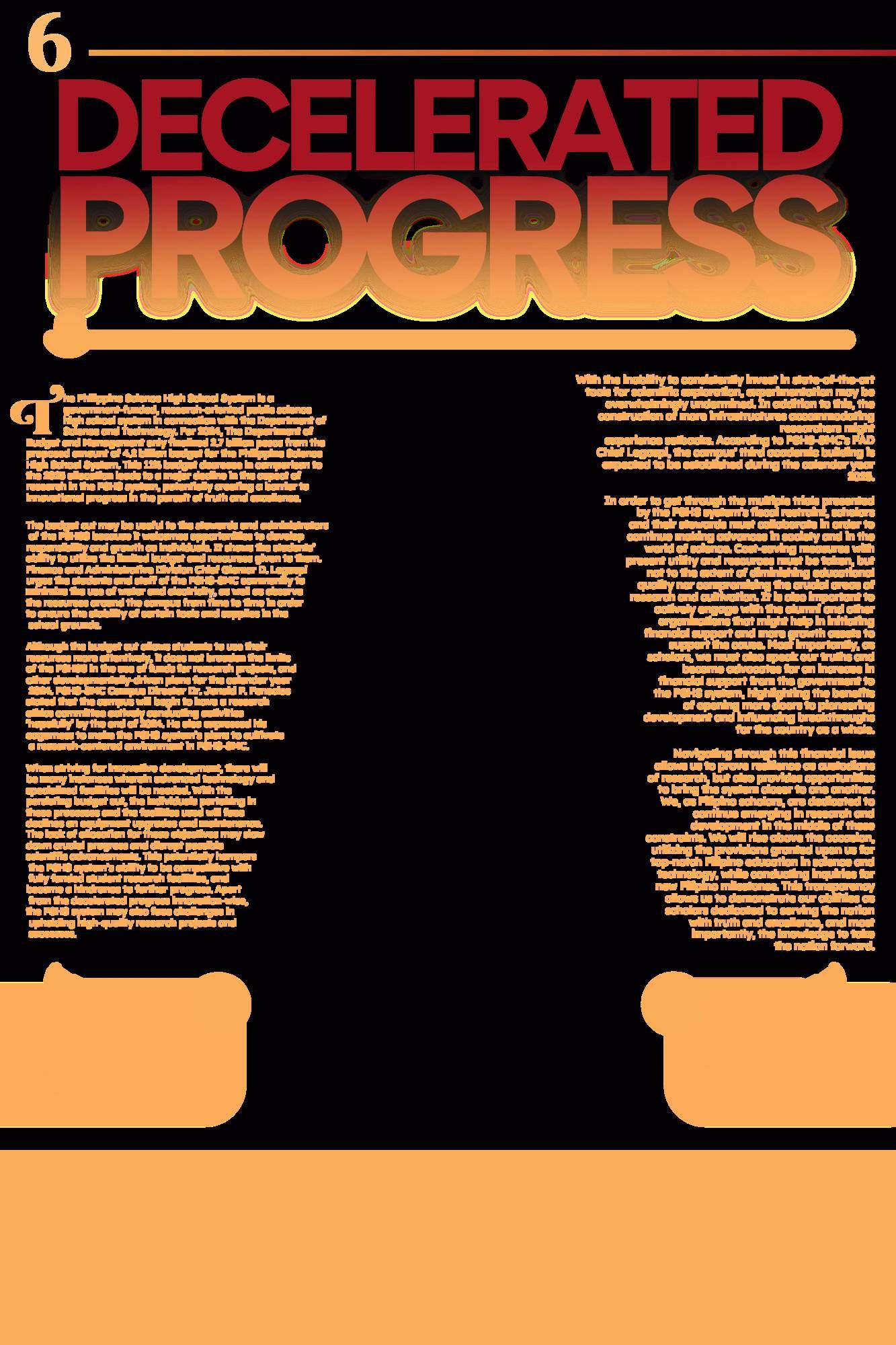 IN THE WAKE of the 329 million pesos budget slash from the Philippine Science High School System (PSHSS), the PSHS–Southern Mindanao Campus (PSHS-SMC) faces unease regarding the continuity of its school activities, leaving its scholars disconcerted due to uncertainties posed by the budget cut.