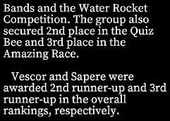 OverseenbyMusicteacherMiss JonaJoyPaladaandPhysical EducationteacherMissNiña HyacinthOsorno,thecollectionof Grade10-11scholarsfirstscoreda positionintheTop5Winnersofthe competition,alongwiththe participantsfromdifferentPisay campusesinthecountry