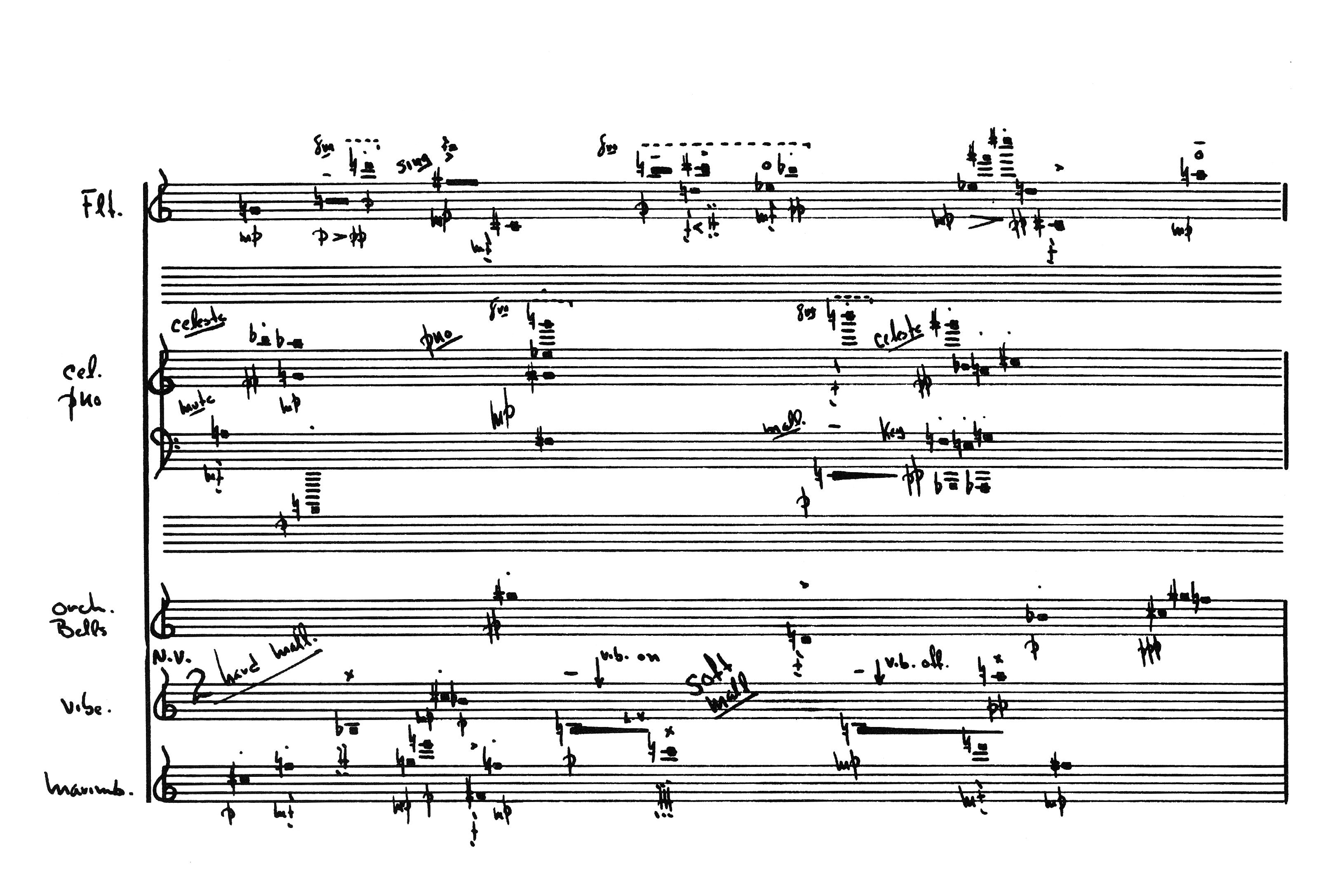 percussion mallets to be used: very soft, soft, medium, hard, very hard. X indicates tones which are to be damped immediately after the attack. Do not allow mallet head to rebound; what is wanted is a very dead, unresonant sound. Other short durations should resonate briefly and then be stopped by hand-damping (where possible) unless – is indicated.