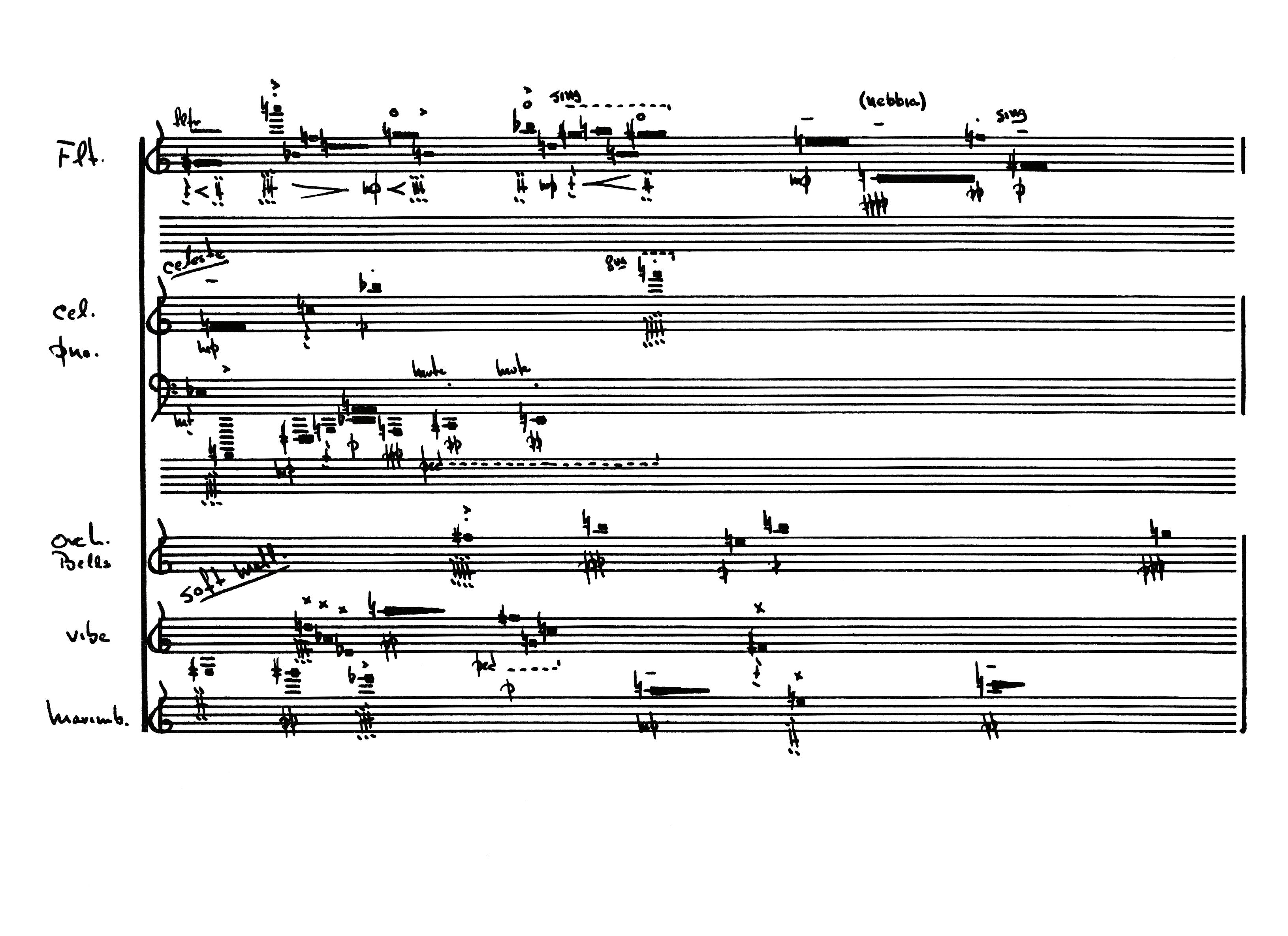 flute “ sing ” indicates a vocal tone to be produced simultaneously with the indicated flute tone, equally loud, in unison or at an interval to the indicated instrumental pitch. (By singing, humming, whistling, etc., the tone quality can be greatly modified, either at the point of attack or gradually and progressively during the sound.) Extreme breath sounds or “key slap” may be used on notes marked > or ˘