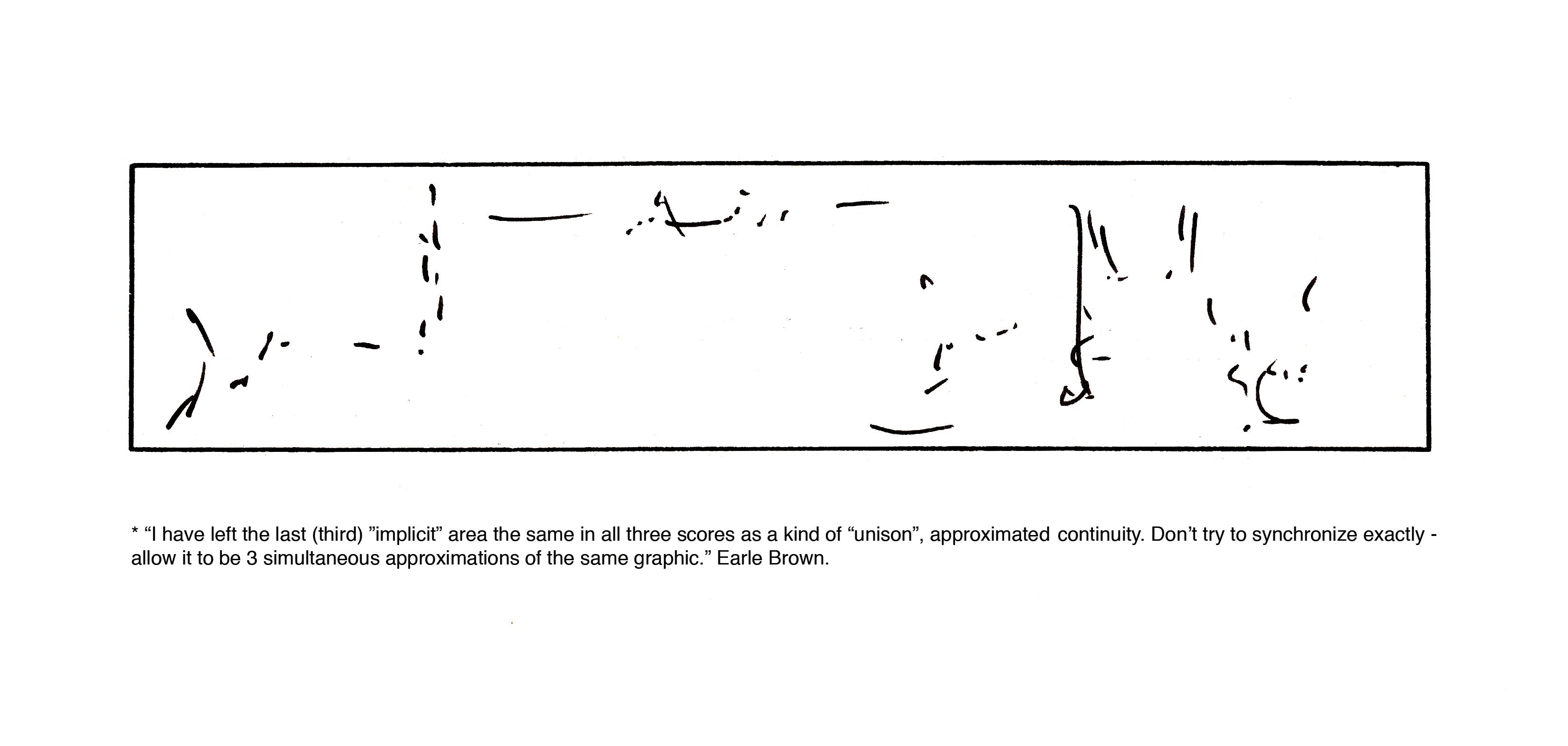 “Implicit” areas (pp. 3 , 5 , 6 , and 7 ) outline the complete frequency range available to any one performer relative to the instruments at his disposal as scored. Any area may be performed by any of the instrumental combinations, but the total frequency range encompassed will of course be different in each case, i.e., it does not matter which instrument plays which “part.” The time-duration will be the same as for the “explicit” areas. The ‘notations’ within the “implicit” areas form trajectories through the total available range and chosen time and are intended to imply the general character of the actions to be taken by the performer. The relative thickness of the lines may be interpreted as varying dynamic (intensity) levels; the configurations of the lines may be interpreted in general to imply staccato or legato attacks, a connected or disconnected type of phrasing, large or small intervals, rates of speed, types of motion, and in general “process through time.” It is the intention that these areas be performed directly from the notation as it exists in this score. If the implications are considered (by the performers) to be insufficient as motivations for a relatively spontaneous action, these areas may be ignored and only the “explicit” systems be performed. If one or more performers find the areas “possible,” the others may remain tacit for the given time. Each performer may employ any of the possible instrumental techniques as he considers them appropriate relative to the “implications.”*