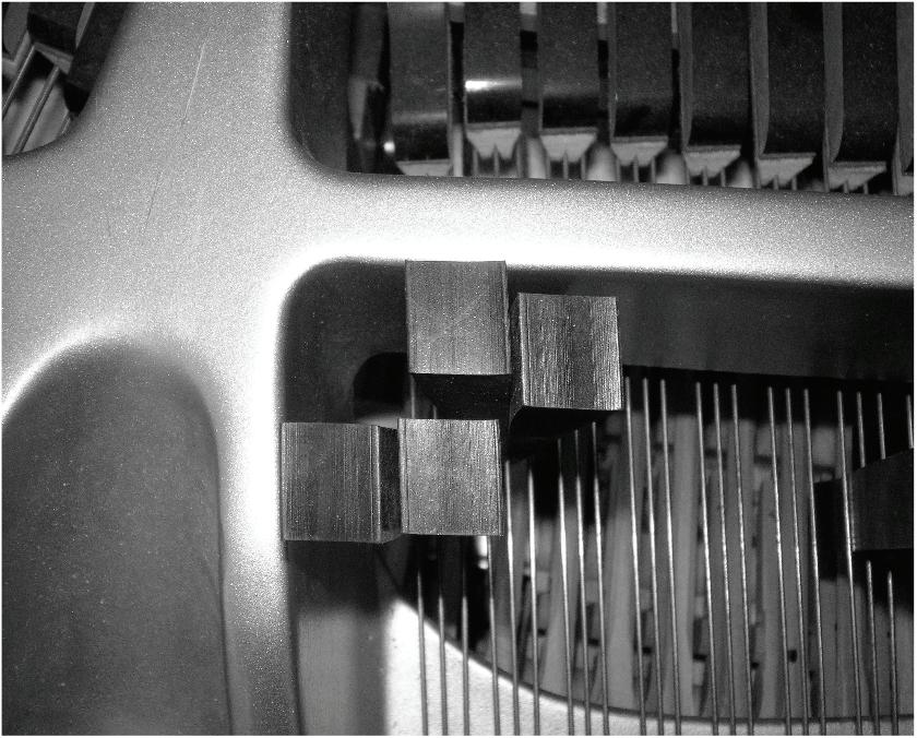 PrÀparation der dreichörigen Saiten (meist h-b1) mit jeweils zwei Keilen Zwischen h und f1 werden die Keilpaare immer versetzt angebracht.