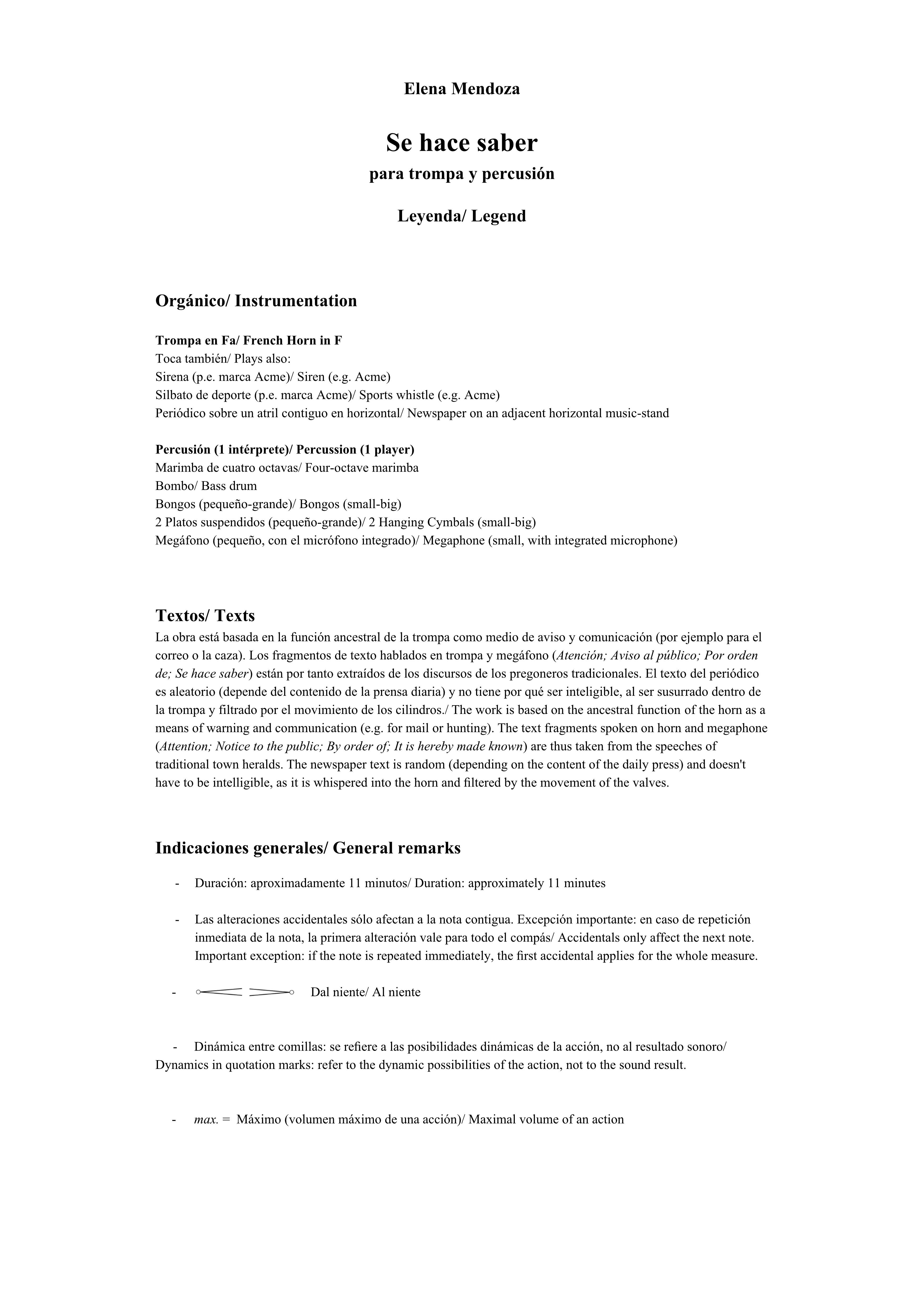 Elena Mendoza (b. 1973) is a native of Seville, Spain, where she studied German language and literature. This was followed by studies in piano and composition in Saragossa with Teresa Catalán, in Augsburg with John Van Buren, in Düsseldorf with Manfred Trojahn and at the Hochschule für Musik Hanns Eisler in Berlin with Hanspeter Kyburz. She held scholarships at various institutions, including the Ensemble Modern Akademie in Frankfurt. Elena Mendoza lives and works in Berlin, where she holds a position as Professor of Composition at the University of the Arts.