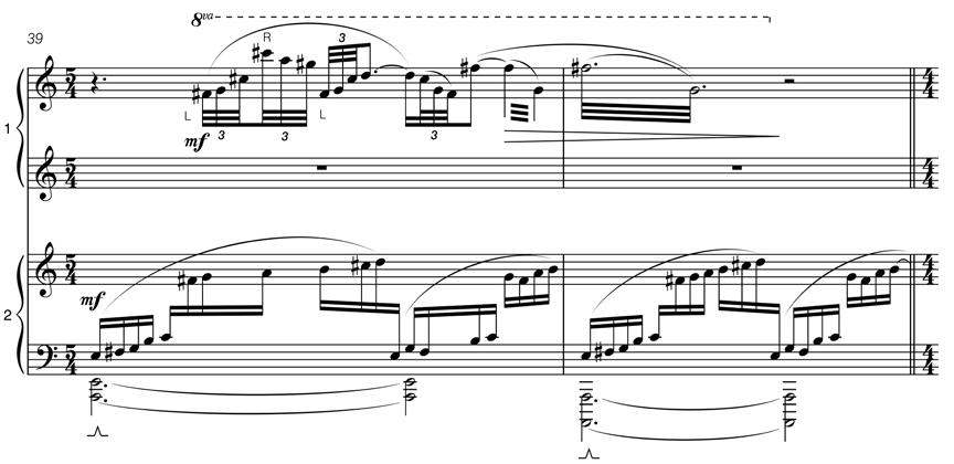 This motivic expansion is mainly delineated in Piano 2. Piano 1 takes a different more fluid melodic role, which might perhaps be interpreted as our own human individual journeys intertwined within a larger Universal context. These upper register melodies access transpositions of the non– octaving mode that produce the ‘outside’ pitches of C# and G#. A mid–movement example of this can be seen at bars 39–40: