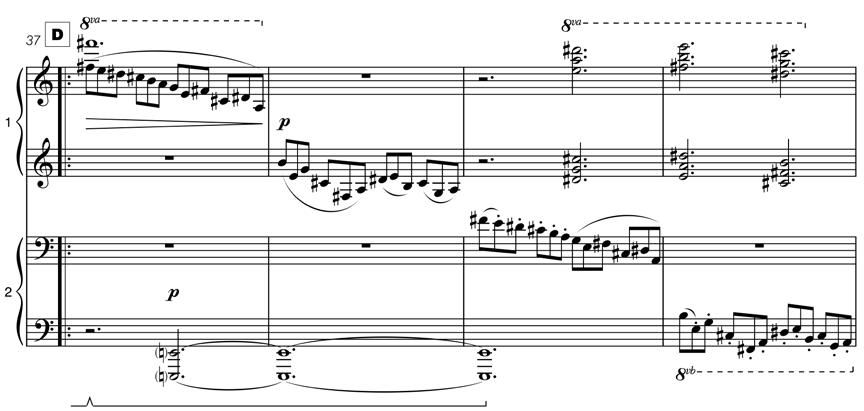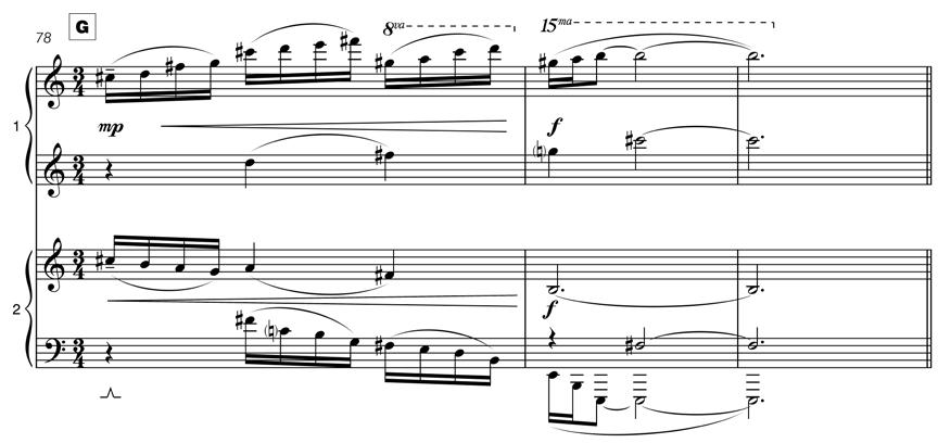 relies on superimposition of different layers, the final movement takes antiphony as the basis of development. Firstly at the level of phrasing (Piano 2 plays letter A by itself, answered by Piano 1 at letter B), and then at a closer level of hocket and close counterpoint found from letter C.