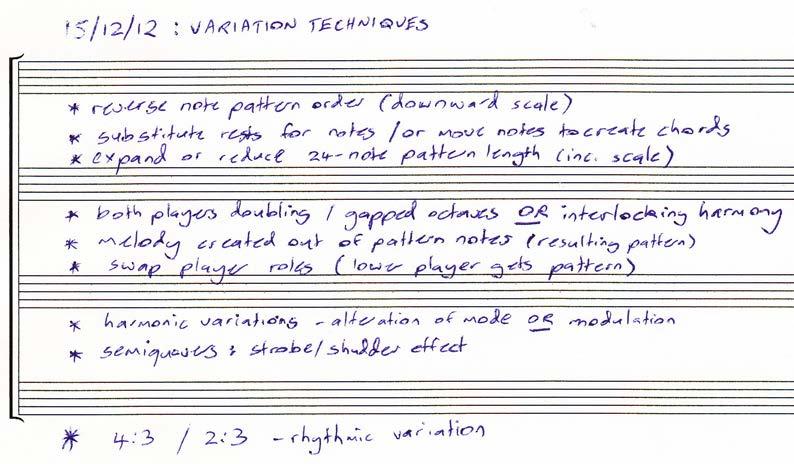 The opening 24–note pattern generated from the 7 pitches (4 against 3) form s the basis of a series of variations that define the 1st movement. Three days after the composition of the pattern, ideas for possible variations were noted down:
