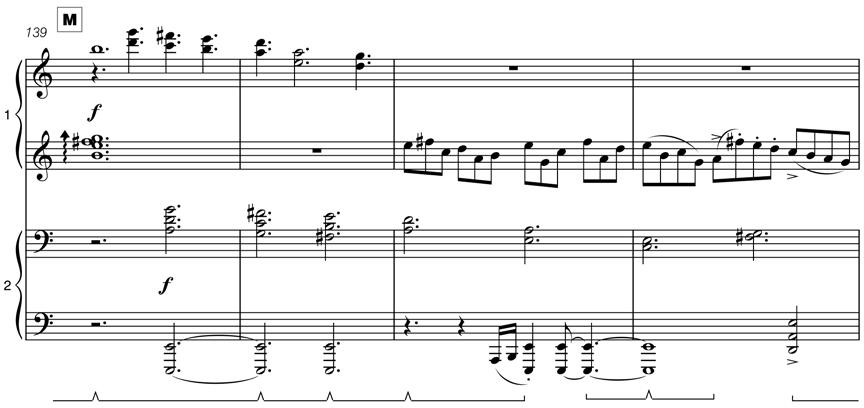 This new gesture (marked in yellow in Exam ple 14) gets abbreviated in the number of notes, but the length of sustain on the final note gets longer. This registral shape deliberately starts with both players on a unison C# and the n spreads out across the entire piano keyboard to reflect the expanding Universe.