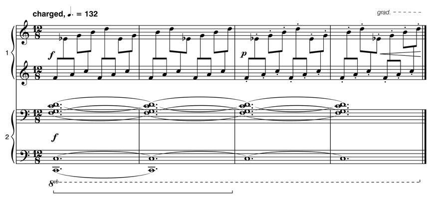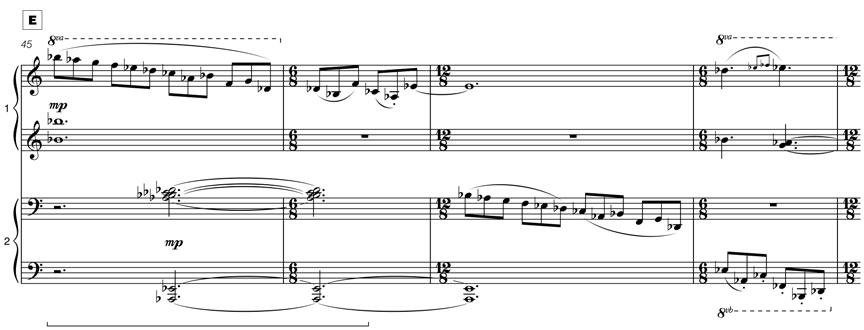 The eventual presence of D natural at bar 15 (entry of piano 1) tem porarily establishes a complete Aeolian mode in E. The remaining two ‘outside’ pitches (C# and G#) only appear in the higher octaves (as determined by the overall pitch system as a fixed register chord) and create subtle but important cross relations. The 2nd movement never modulates – staying fixed in relation to the harmonic centre of E throughout.