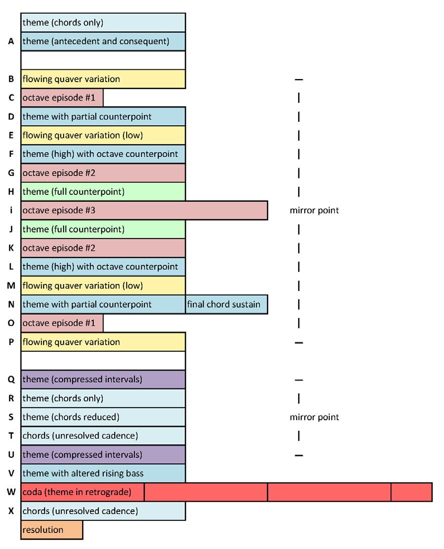 A structural chart reveals a hybrid of theme and variations, internal arch form s and an extended coda: