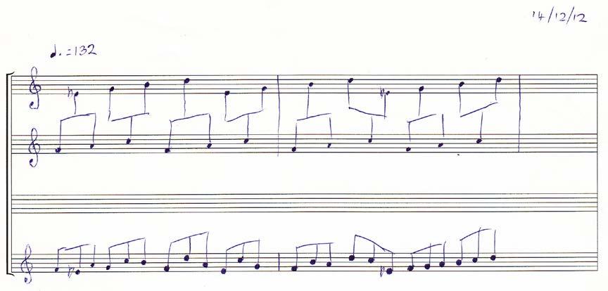 This first sketch from December 2012 shows how the notes are divided between two hands on a grand staff and then the resultant line created below.