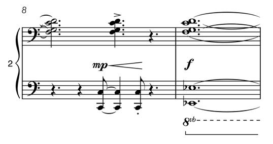 The sustained chords in Piano 2 are often suspended harmonies. The voicing above has an added 9th and 11th but no 3rd. These sustained chords are punctuated by syncopated anacrusis figures like that found at bar 8: