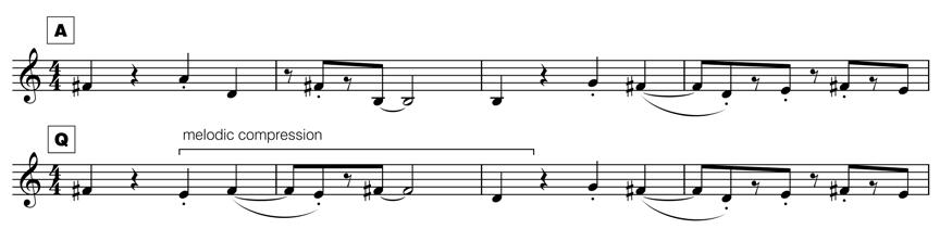 Two notable developmental features are an intervallic compression of the theme (letter Q) and the theme in retrograde at the coda (letter W ). The compressed interval theme at letter Q retains the main theme’s rhythm, but restricted to the first 4 notes of a major scale: