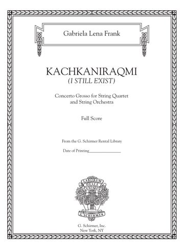 “Kachkaniraqmi,” or “I still exist” in the indigenous Quechua language of my Peruvian forebearers, speaks to the resilience, even insistence, of a racial soul through the generations. In this four-movement work, a brief pastoral Andean prelude, a moody mountain soliloquy, a romp of thieving winds, and a lyrical child’s wake utilize the sonorous possibilities of a concerto grosso for string quartet and string orchestra, variously celebrating the quartet as its own ensemble, as soloists, and as section leaders within the orchestra. Throughout, re-imaginings of age-old indigenous motifs and rhythms proliferate.