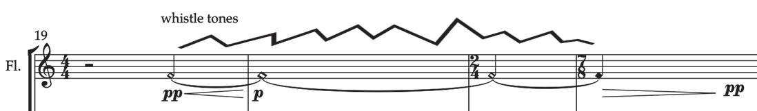 An exploration of the partials of the specific toneisintended to stand alone or mix with the sound of the ensemble. The movement within the whistle tonesis intended to follow the physicality of the tone;not too fast movementsbetween the partials,andplease play around with the different partials in an order that explores the harmonicsin a nonlinear way.