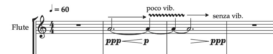 The “ss” sound should be producedwith themouthonly, not with or through the instrument. When making the "ss" sound: start with a smile-like mouth position w. the tongue placed forwards towards the teeth (aim for higher partials of the "ss" sound) -gently move to a trumpet-like mouth position w. the tongue placed loweror slightly more backwards in the mouth (aim for lower partials) and then move back. Focus on a gradual change and a continuous life in the sound of the partials. The sound / technique is almost inaudible but impacts the overall sound because the “ss”sound mixes with the whistle tones and flageolets, as a slight shadowchanging the environment and thereforthe sound changeswhat we expect to hearand makes the music thus more magical. Creating the sound,should visually not draw too much attention on stage. The movement can be done rather elegantly and still with a grand sonic effect. In general, the sound should be produced with more focus on highpitched air-sounds, than actually "saying the s".