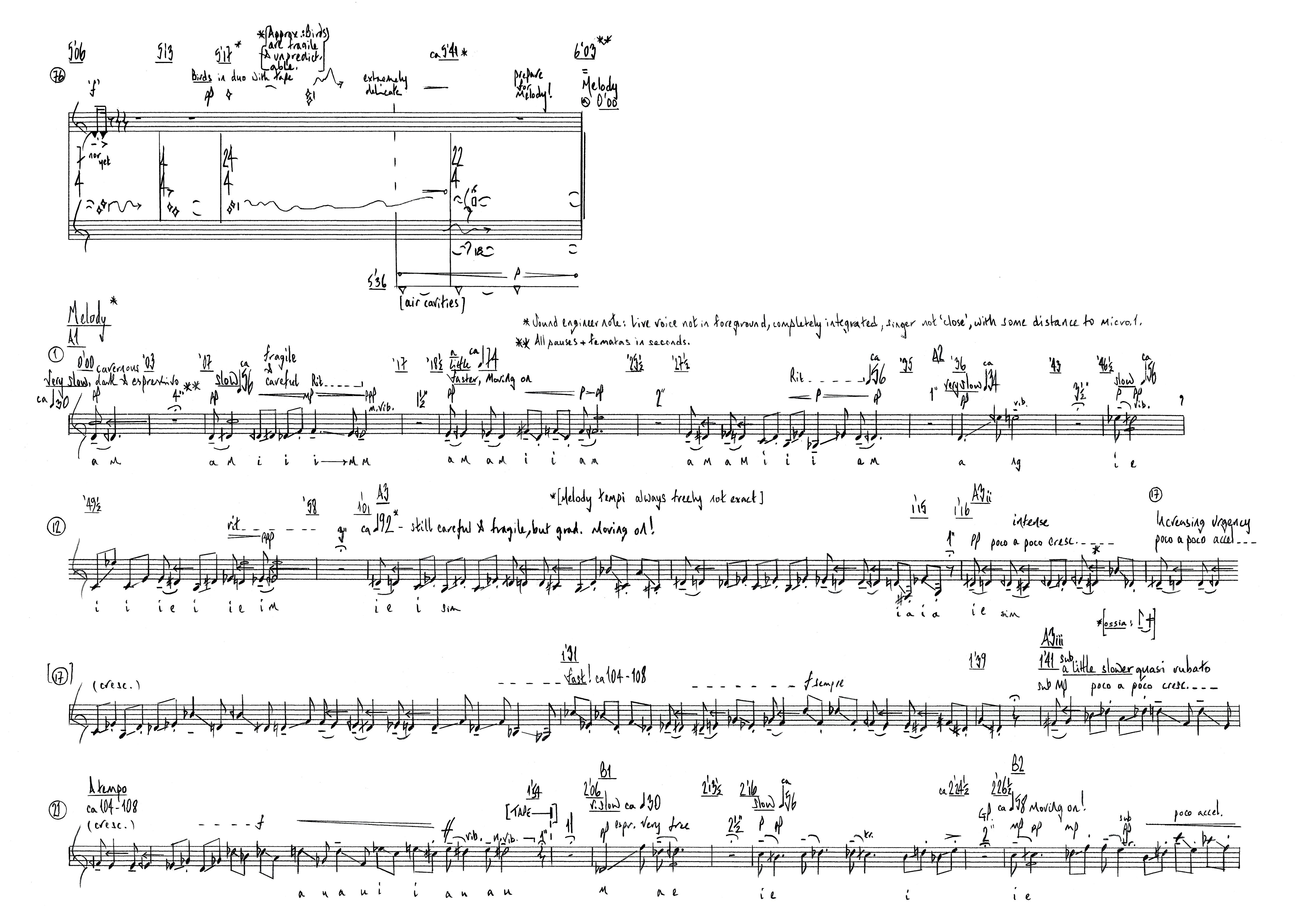 Ideal timings for the start of Melody and Noise are provided, although additional electronic playback is provided. In this case, the singer can cue the sound engineer when she is ready for the timer to be re-set to 0ʹ00ʺ at Melody and Noise, or alternatively to operate herself with a foot-pedal or on a touchscreen interface.
