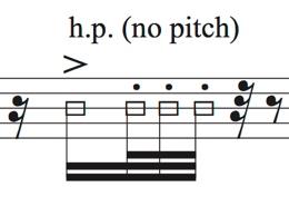 h.p. (no pitch): heaviest, pure noise (staff position not indicative of pitch level) , multi, multiph: stable, dissonant multiphonic sound on given note