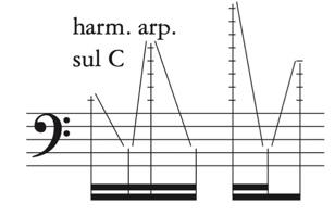 harm. arp.: Harmonic arpeggio. Rhythm and movement trajectories of the left hand are suggested by the indeterminate notation.