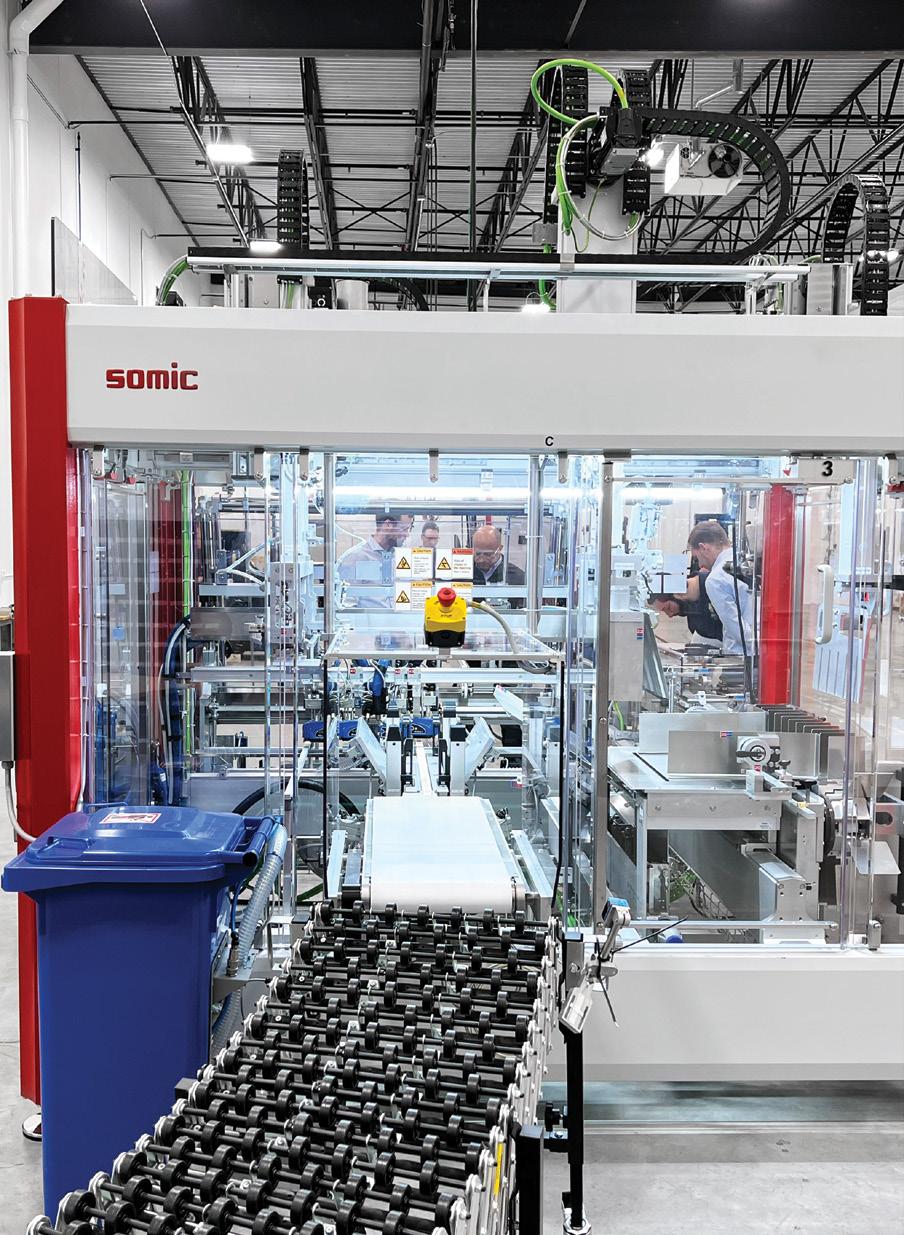 Every detail matters SOMIC considers several factors when developing turnkey equipment for high-volume applications. The shipping case gives the retailer or consumer their first impression of the product and its manufacturer. SOMIC adjusts case dimensions and functionality as needed when configuring the machine for efficient palletizing, product protection, attractive presentation on store shelves, and easy shipping case handling and opening.