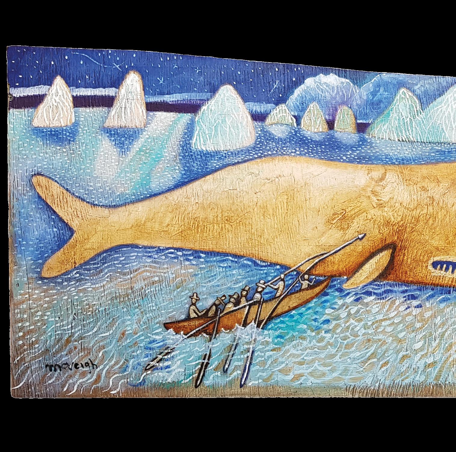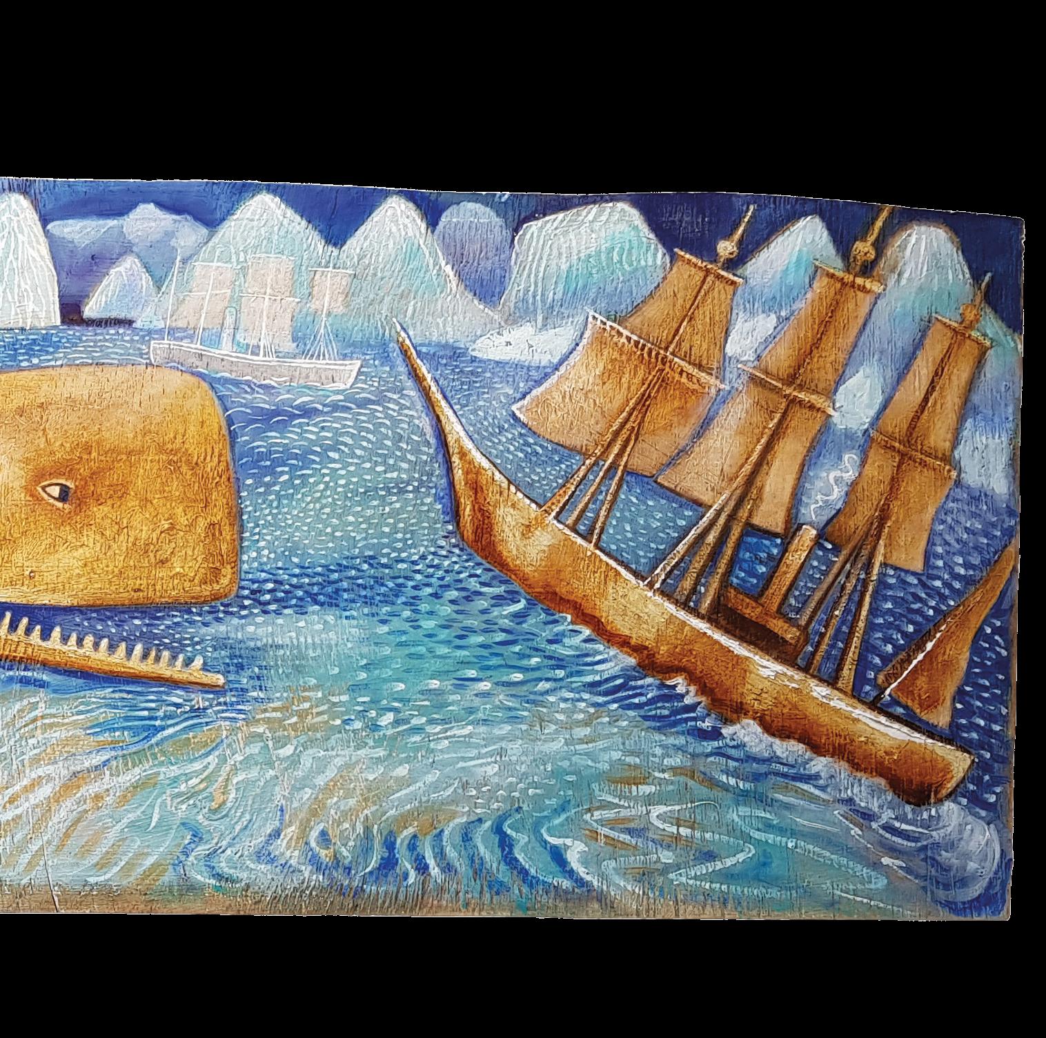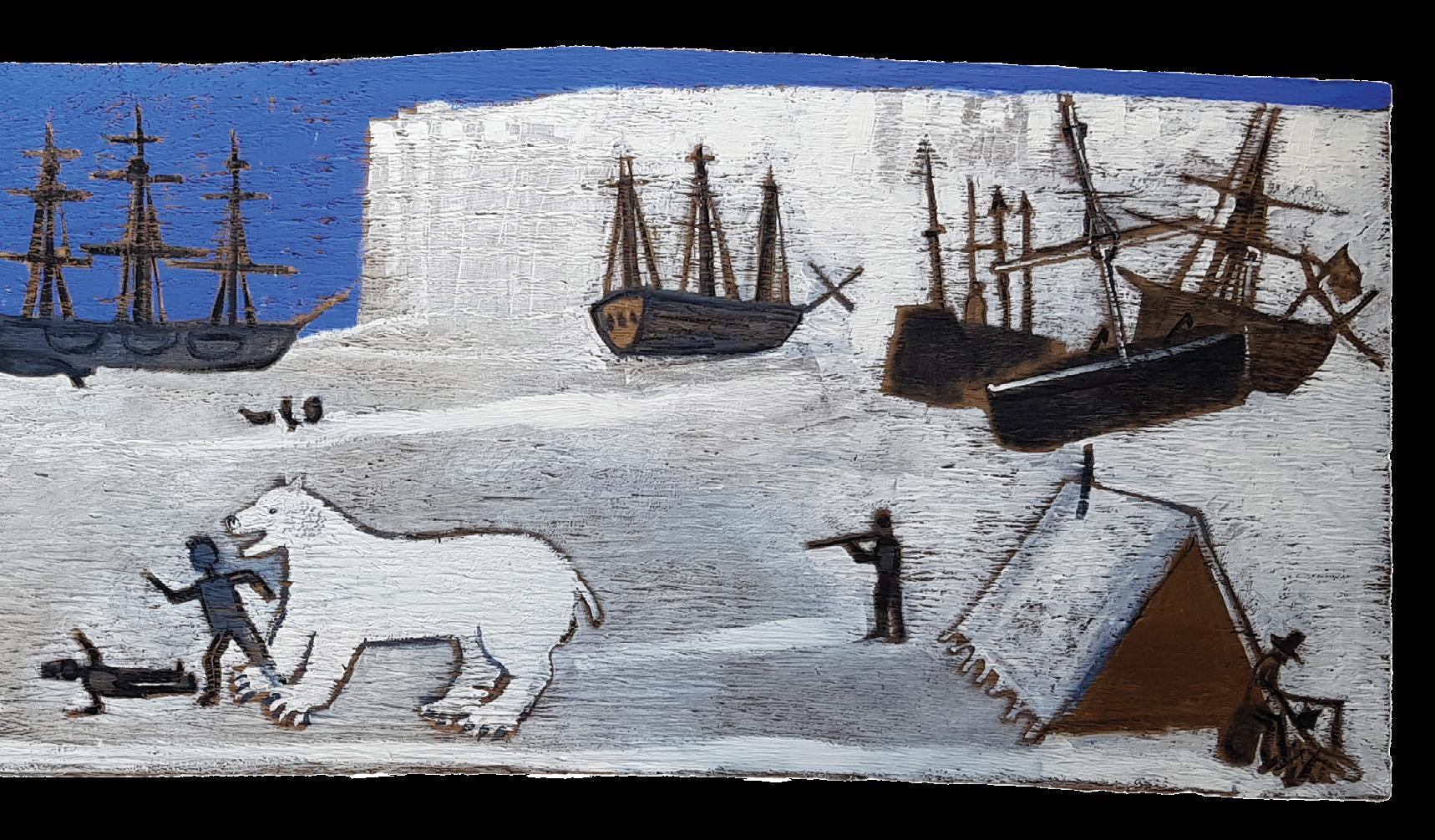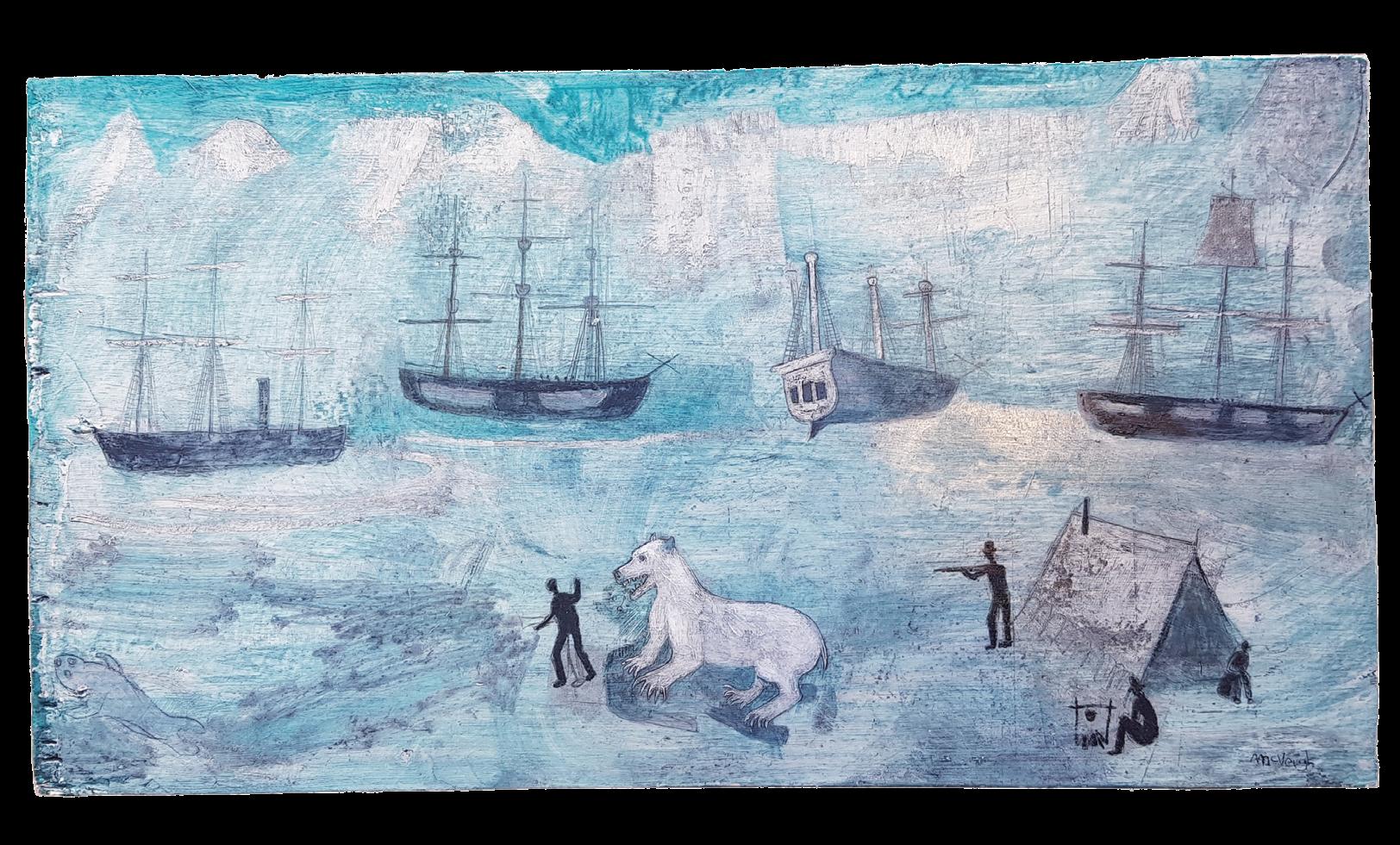 This grounding in personal history and Scottish life finds powerful expression in this exhibition Dundee Whalers, which returns him to the maritime heritage of his birthplace. Inspired by childhood visits to the McManus Gallery and stories of the Tay Whale, alongside historic drawings made by 19thcentury whalers, McVeigh explores Dundee’s once-thriving whaling industry, when ships sailed to the Arctic and Antarctic to harvest whale oil used to light cities such as Edinburgh, and to soften jute fibres used in the once booming Dundee textile trade. The works depict ships crushed in encroaching ice, sailors stranded on frozen seas, encounters with polar bears, and hunting of whales, scenes drawn from archival sources but reimagined through his own distinctive, narrative lens. Some painted on rough, textured wood that enhances their primitive immediacy, the works evoke endurance, hardship and survival, blending documented history with imagination and folklore. In Dundee Whalers, McVeigh once again assumes the role of chronicler, visualising a controversial chapter of Scotland’s industrial past into a raw and compelling human saga.