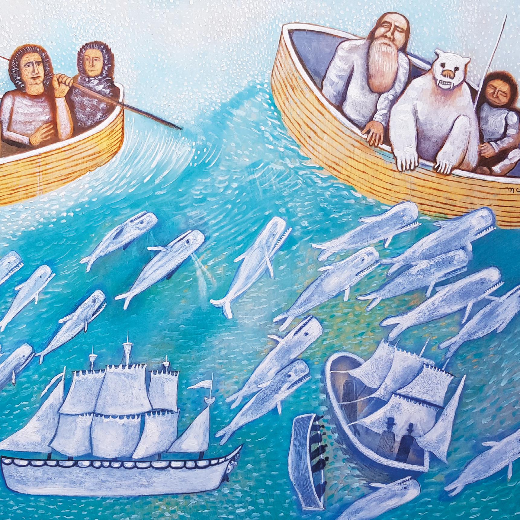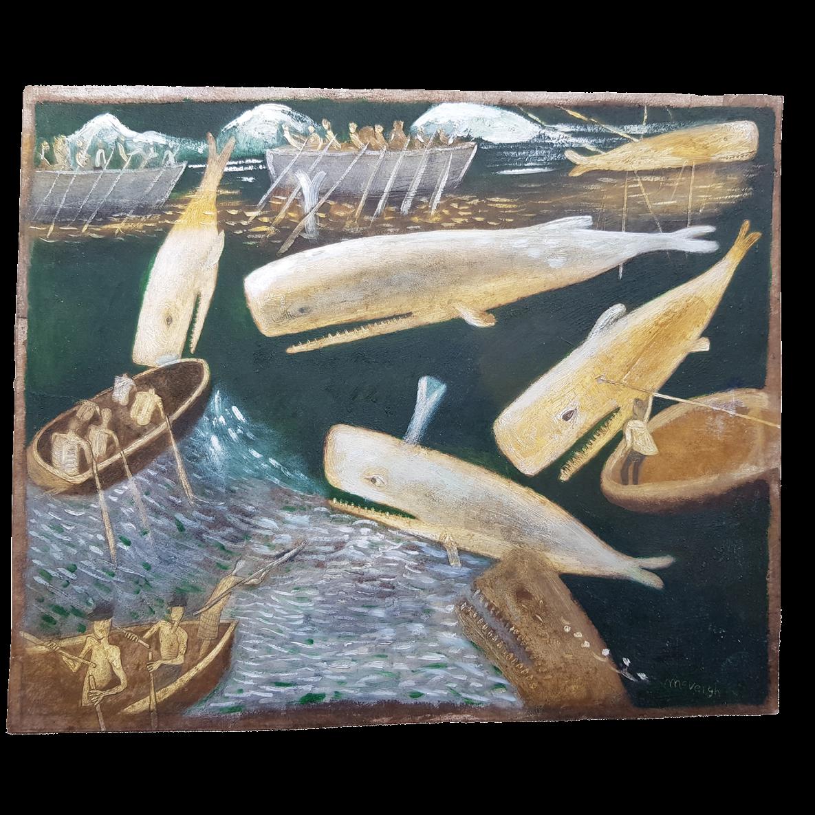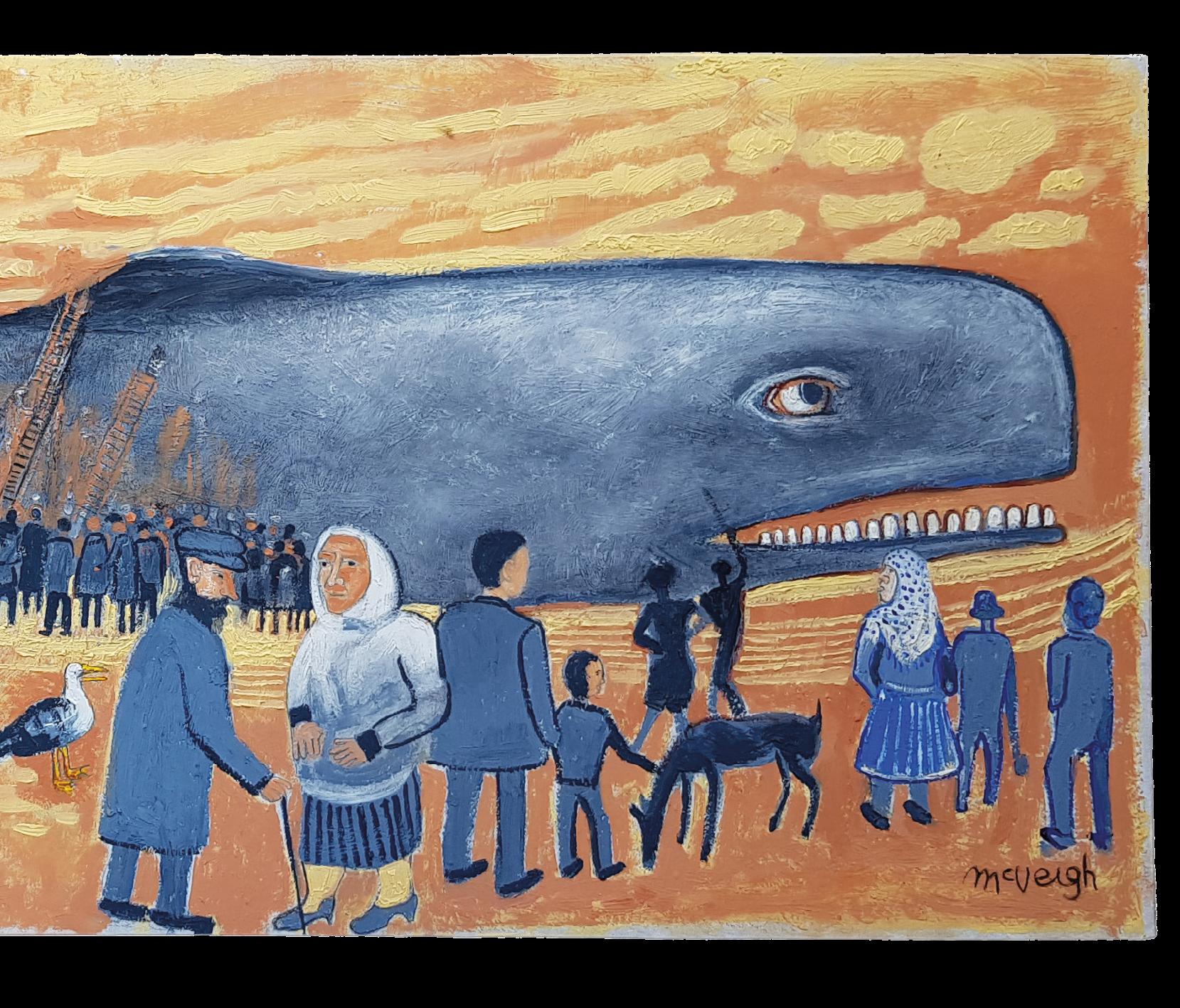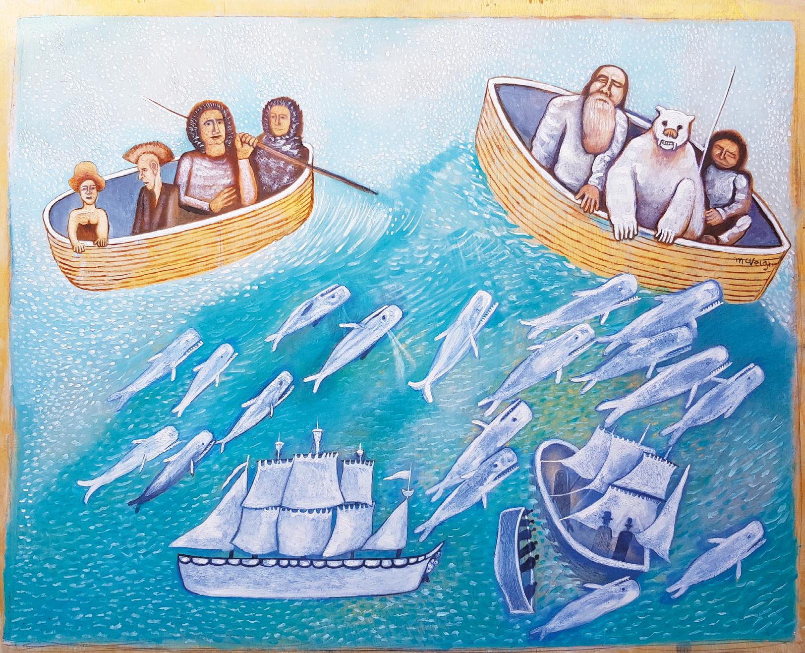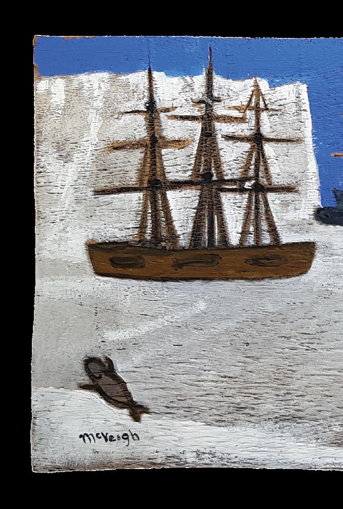 This grounding in personal history and Scottish life finds powerful expression in this exhibition Dundee Whalers, which returns him to the maritime heritage of his birthplace. Inspired by childhood visits to the McManus Gallery and stories of the Tay Whale, alongside historic drawings made by 19thcentury whalers, McVeigh explores Dundee’s once-thriving whaling industry, when ships sailed to the Arctic and Antarctic to harvest whale oil used to light cities such as Edinburgh, and to soften jute fibres used in the once booming Dundee textile trade. The works depict ships crushed in encroaching ice, sailors stranded on frozen seas, encounters with polar bears, and hunting of whales, scenes drawn from archival sources but reimagined through his own distinctive, narrative lens. Some painted on rough, textured wood that enhances their primitive immediacy, the works evoke endurance, hardship and survival, blending documented history with imagination and folklore. In Dundee Whalers, McVeigh once again assumes the role of chronicler, visualising a controversial chapter of Scotland’s industrial past into a raw and compelling human saga.