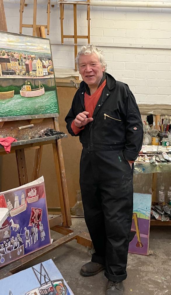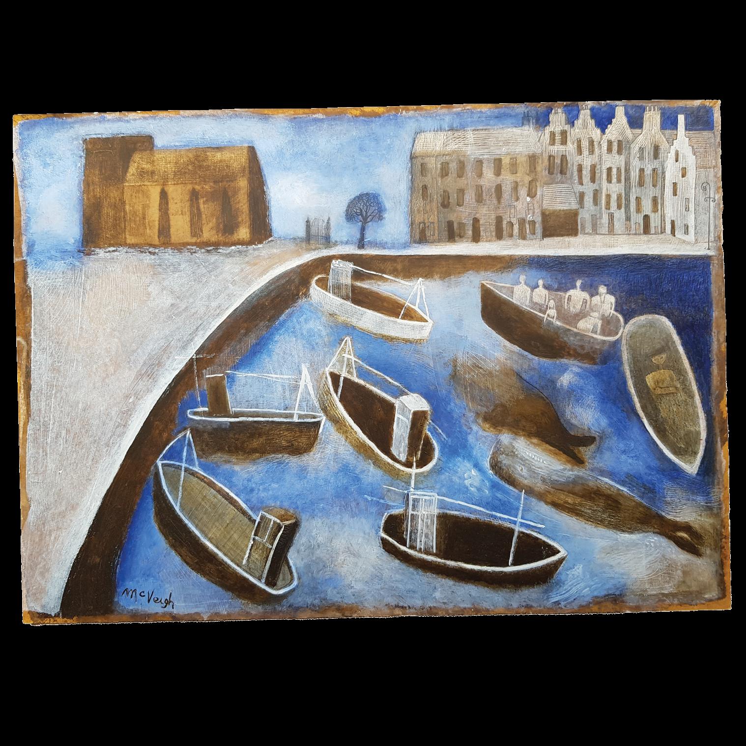 Michael McVeigh was born in 1957 in the post-war council estate of Lochee, Dundee. Leaving school without formal qualifications but determined to become an artist, he began attending classes unannounced at Duncan of Jordanstone College of Art until the painter James Morrison recognised his talent and formally accepted him as a full-time student on the strength of his drawings and paintings alone. Since moving to Edinburgh in 1982, McVeigh has become a familiar figure within the city, regularly seen working outdoors and, until recently, selling his distinctive ‘lizard’ prints from a stall on Rose Street. A figurative painter and printmaker, he has been described as a modern-day folk artist and participant observer, chronicling Scotland’s people, places and traditions with a style that moves between folk-art directness, visionary imagination and a late-Realist social awareness. His works are held in both public and private collections, ranging from town halls and municipal institutions to pubs and fishmongers, reflecting the accessibility and honesty of his practice.