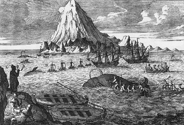 Whaling at Jan Mayen Island, Norwegian Arctic, 18th century etching