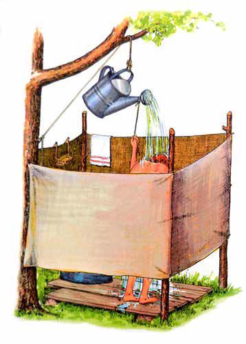 Traditional Camp shower using a water container to provide a ‘cold shower’