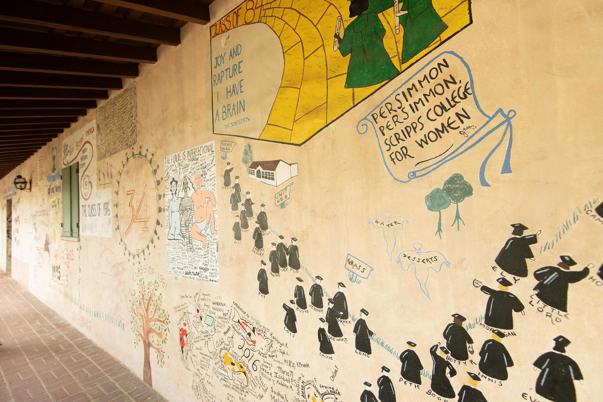 Every year, the seniors create a design that represents their time at Scripps and the world in which they graduated. Once the design is painted onto the wall by an artist from the class, each senior signs their name around the design; it is a powerful representation of what collective success looks like at Scripps.