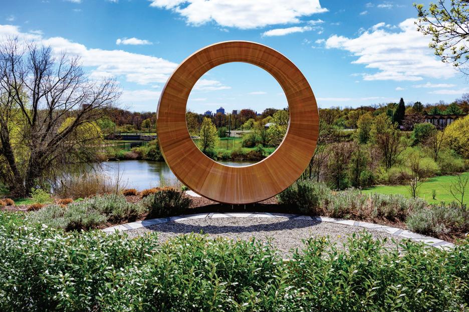 The bronze sculpture, Serie Metafisica XVIII, overlooks the campus pond.
