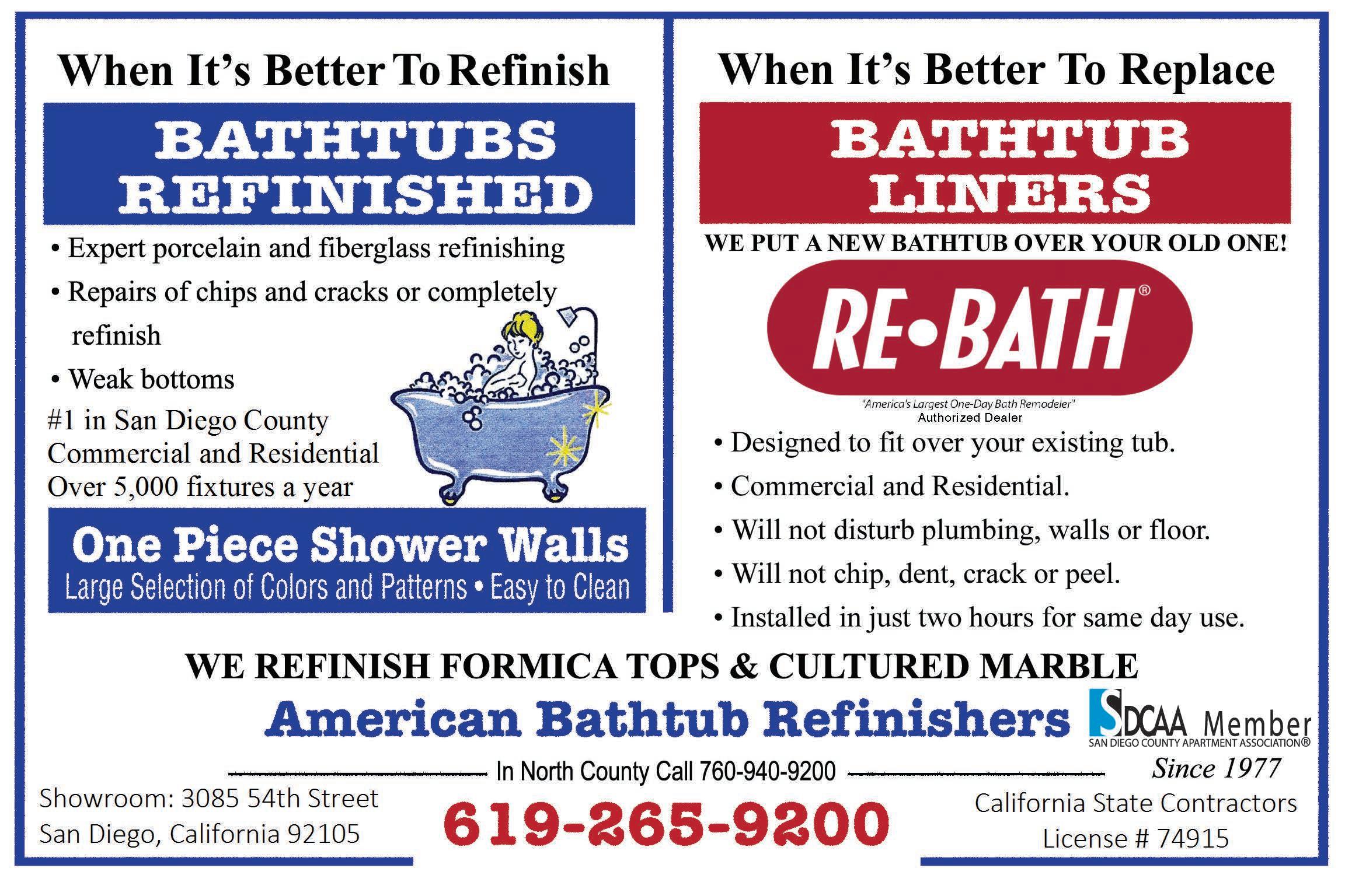americanbathtub • Porcelain Sinks • Porcelain Bathtubs •Wall Sinks • Bath Bowls • Kitchen Sinks • Kitchen CounterTops • Fiberglass Bathtubs • Fiberglass Showers • Pedestal Sinks •Vanity CounterTops •Tile Surrounds •Wall Surrounds • Crack & Chip Repair • Plumbers Cutouts •Terrazzo Pans • Complete Support & Cutouts Porce lai n an d Fiber glass Surfaces Servi ng A ll O f San D i ego C ou nty C ali forn ia Stat e Contract ors L ic ense #74891 5 A ll of ourSer vi c es : 619-265-9200 619-265-8126 858-642-9200 North County 760-940-9200 Bathtub Refinishers Bathtub Liners / Complete Bathroom Remodels • Expert porcelain and fiberglass refinishing • Repairs of chip and cracks or completely refinish • Weak bottoms • Designed to fit over your existing tub. • Commercial and Residential • Will not disturb plumbing, walls or floor. • Will not chip, dent, crack or peel. • Installed in just two hours for same day use. SDCAA member since 1977 SCRHA Member Since 1977