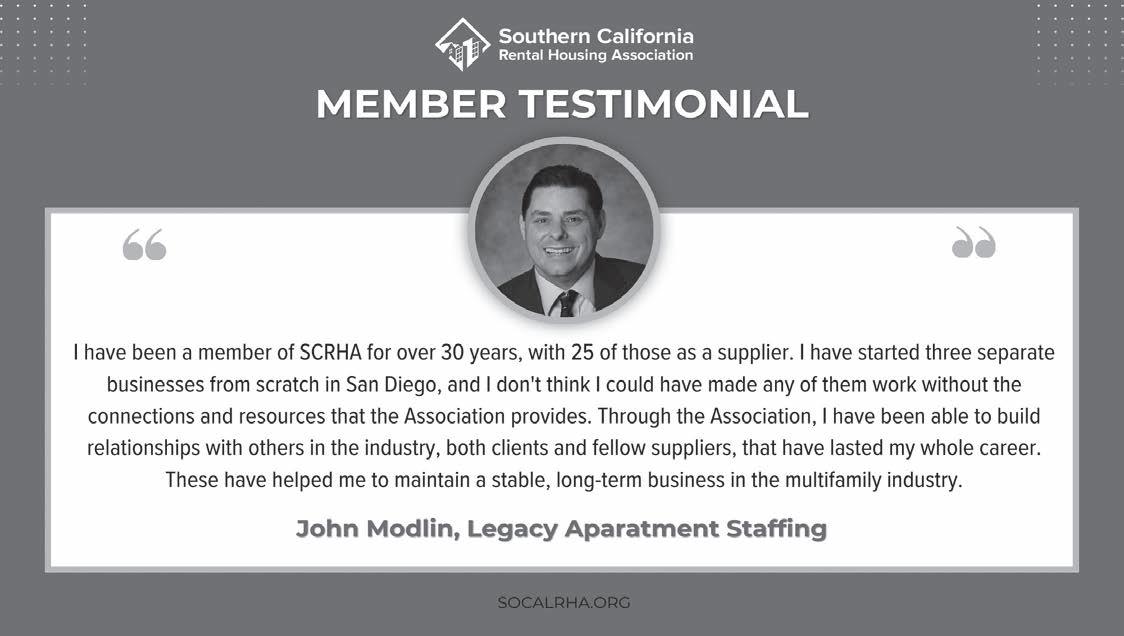 AsmembersoftheSouthernCaliforniaRentalHousing Association,wearepartnersincreatingathrivingcommunity byprovidingqualityrentalhousingforall.Wevalueour residents,ourfellowmembers,andourcommunityandare workingtosupportahealthyhousingecosystemthrough advocacy,education,andcollaboration.