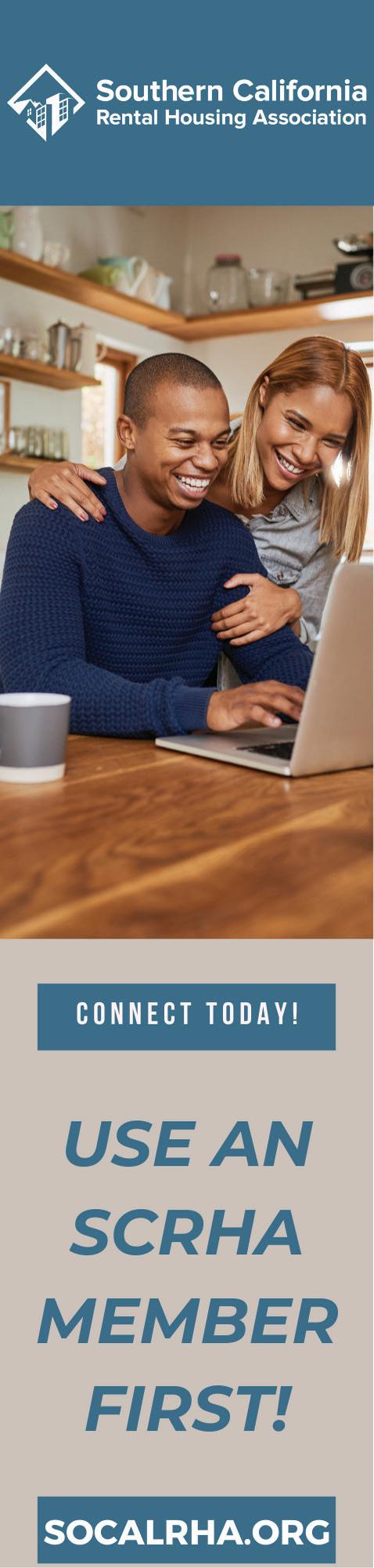 s we move into the second half of the year, I want to thank you for your continued support of the Southern California Rental Housing Association Your engagement, through events, advocacy, education, and committee work, keeps our organization strong and focused on serving the needs of rental housing providers across the region .