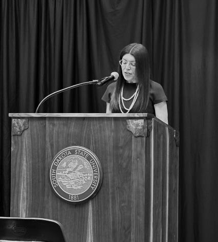 Collegian photo by GRETA GOEDE Director of the School of American and Global Studies Christine Garst-Santos announces the new Mike Huether Public Service Academy program coming to SDSU at a press conference Tuesday, April 9.