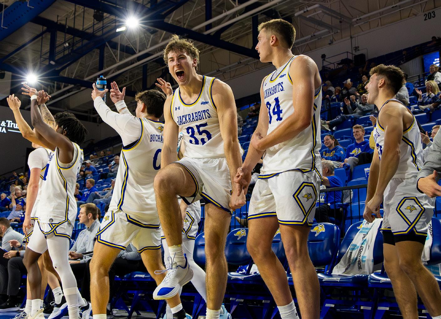 SDSU’s bench celebrates during a basketball game against Mayville State on Oct. 29, 2025 at First Bank & Trust Arena.