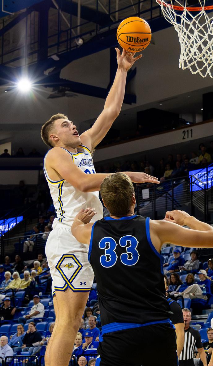 Kalen Garry shoots a layup during a basketball game against Mayvillen State. Garry averaged 10.7 points, 5.2 rebounds and 3.2 assists a game.