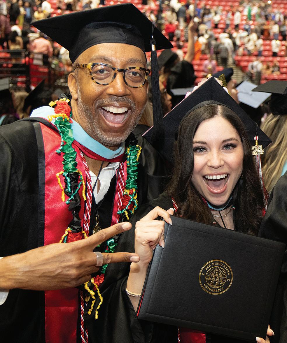 With each passing year, our SDSU family continues our commitment to academic excellence, scholarly research, and community engagement and inclusivity. These shared values empower our students, faculty, and sta to soar and foster an environment in which ideas and dreams flourish. Ours is truly a university on the rise, driving innovation and delivering impactful results, and I am honored that you are a part of our story. Alongside our dedicated donors, partners and friends, we have achieved new heights in our 127th year — from record enrollment and reaching a milestone of half a million living alumni to celebrating The Campanile Foundation’s 25th anniversary, securing record-breaking research funding and expanding our university’s footprint, just to name a few. At every turn and in every way, your kindness enhances the Aztec experience. Thank you for joining us on this journey to build a better future for the university and those we serve. We are deeply grateful for your support.