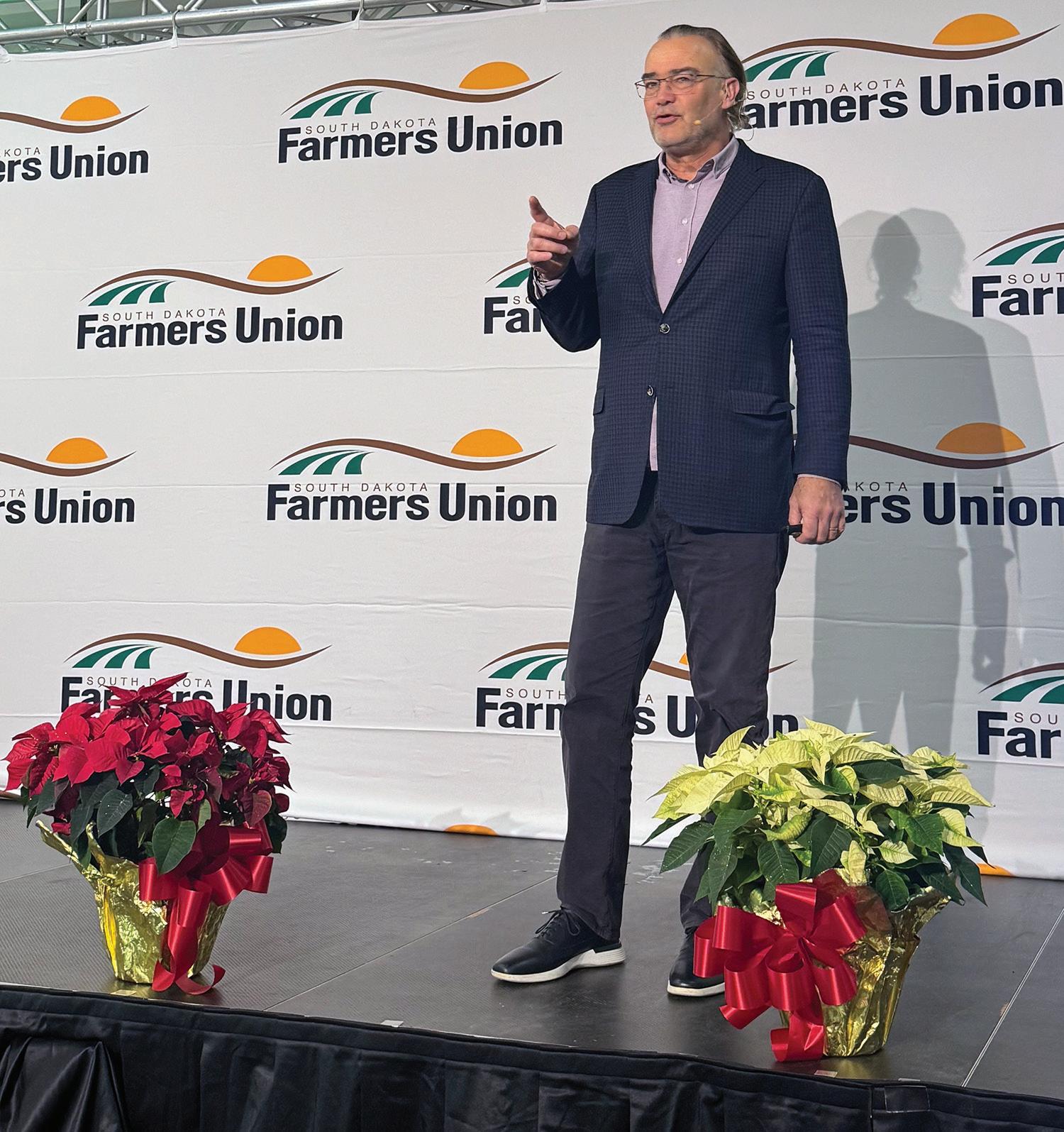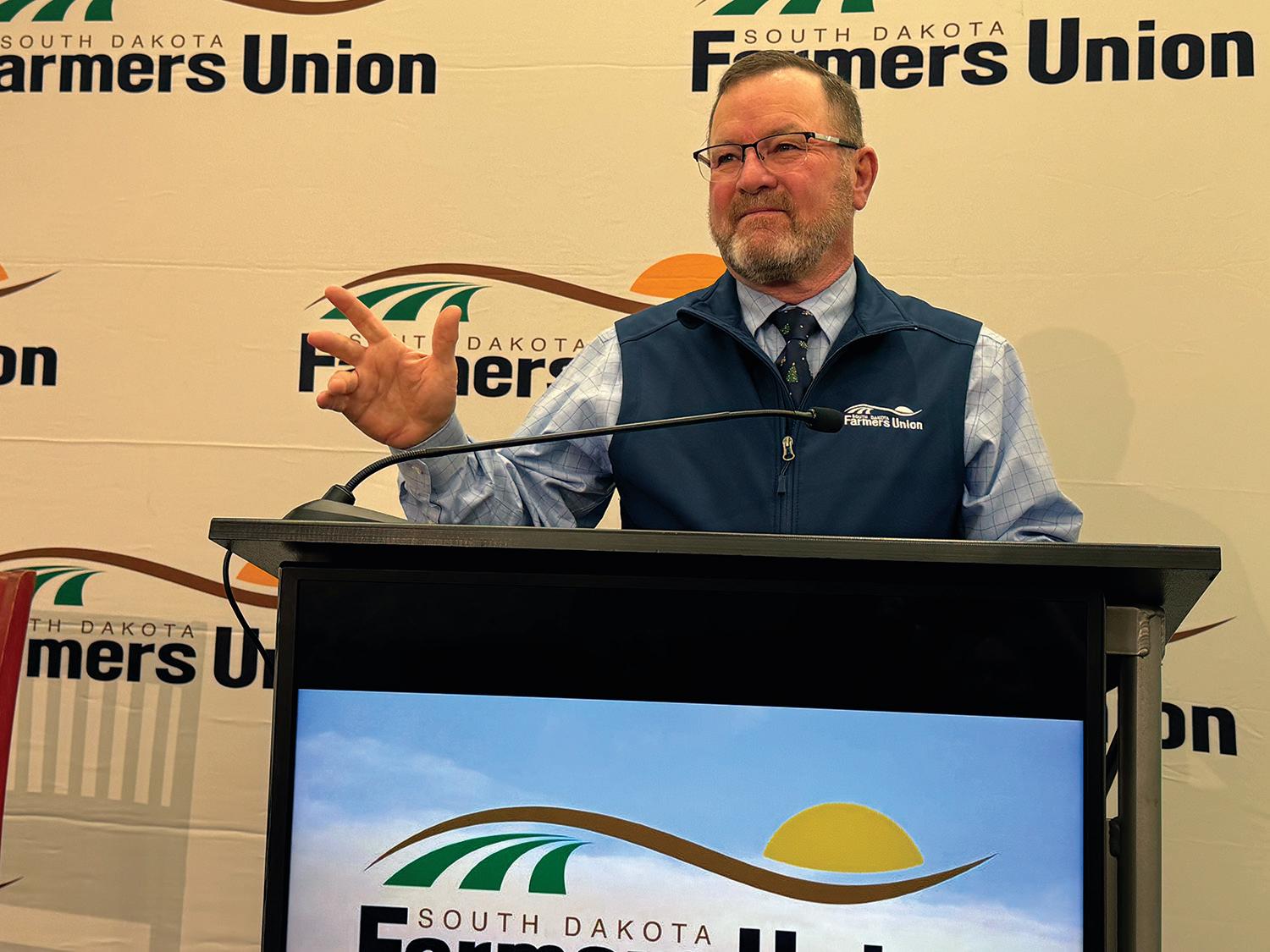 “We can be polite, but we cannot be polite at the expense of things we need as family farmers and ranchers,” Larew said as he addressed South Dakota Farmers Union members during the 110th State Convention held Dec. 10 and 11 in Huron. “The idea that somehow these rural communities are just going to survive on their own and we are just going to let rural healthcare facilities go away and we are not going to make sure that family farmers and ranchers have a fair shot from one year to the next in a marketplace that is not functioning – in a beef market that lacks transparency – and while we can say, ‘thank you,’ and show gratitude for the $12 billion, we need to lean into the stubbornness and say, ‘This is what my community needs. We are not going to give in and watch rural communities lose healthcare clinics or young farm and ranch families.’”