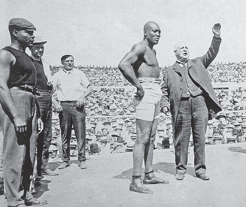 Jack Johnson, first Black Heavyweight Champion, defended his heavyweight against James J. Jeffries. The fight took place on July 4, 1910, in front of nearly 20,000 people, at a ring in downtown Reno, Nevada. By the 15th round, after Jeffries had been knocked down twice for the first time in his career, Jeffries’ corner threw in the towel to end the fight.