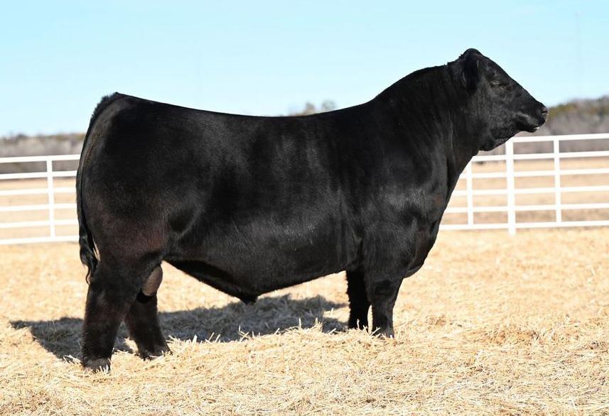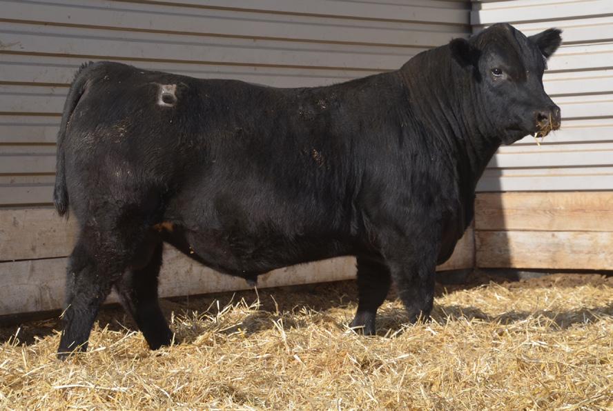 Larger frame with extreme length on big foot and hoof. Warrior is a meat wagon that sires a killer look with good temperament. Dam is an impressive cow that has been flushed with progeny in many sales for Koupal B&B Angus.