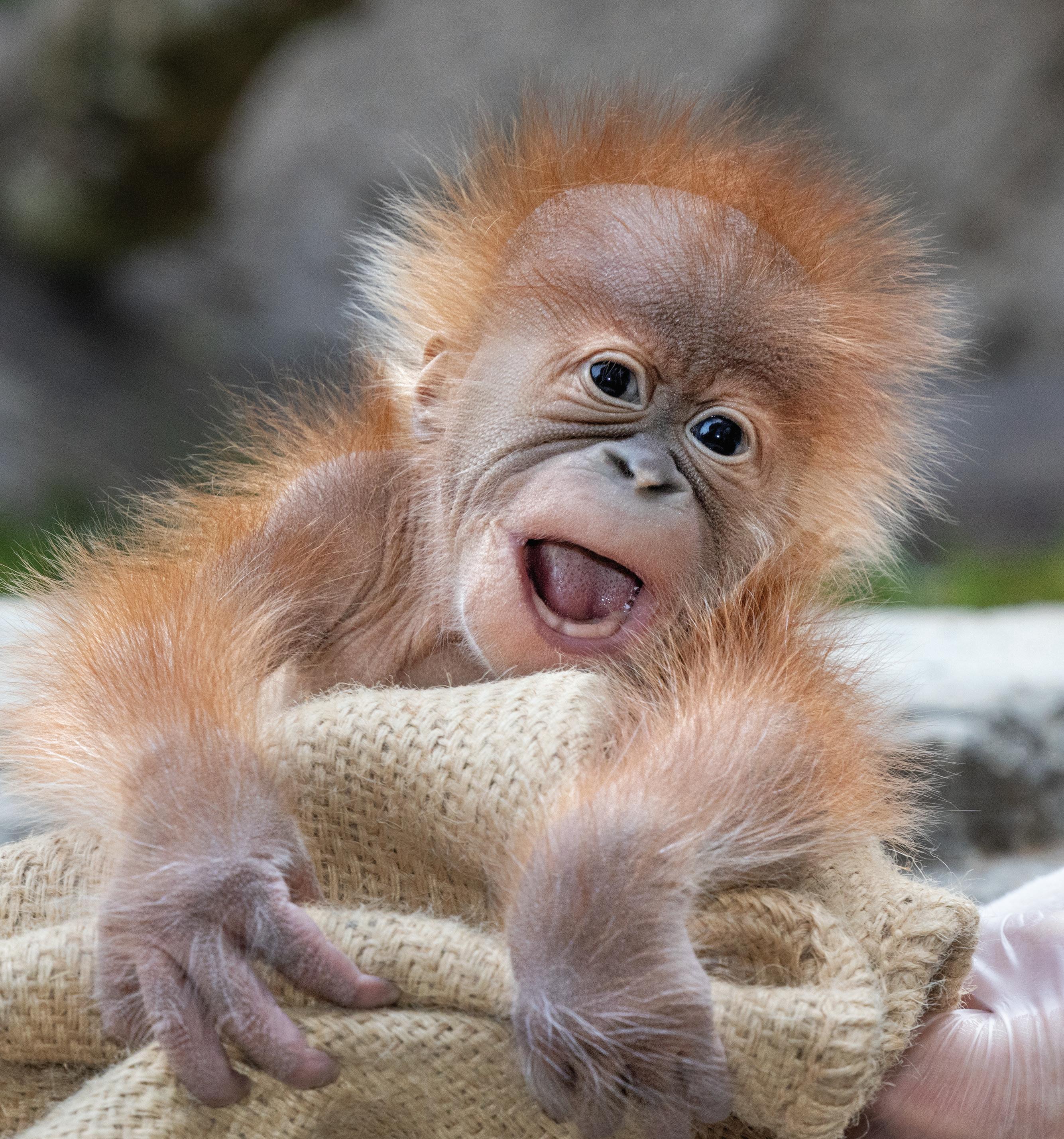 On January 4, 2022, an orangutan infant was born at the San Diego Zoo. Indah, a 35-year-old Sumatran orangutan, gave birth to a healthy baby boy. He was named Kaja, in honor of an island in Kalimantan, the Indonesian part of Borneo, which houses rehabilitated Bornean orangutans prior to their habitat reintroduction. Photographed by Ken Bohn, SDZWA photographer.