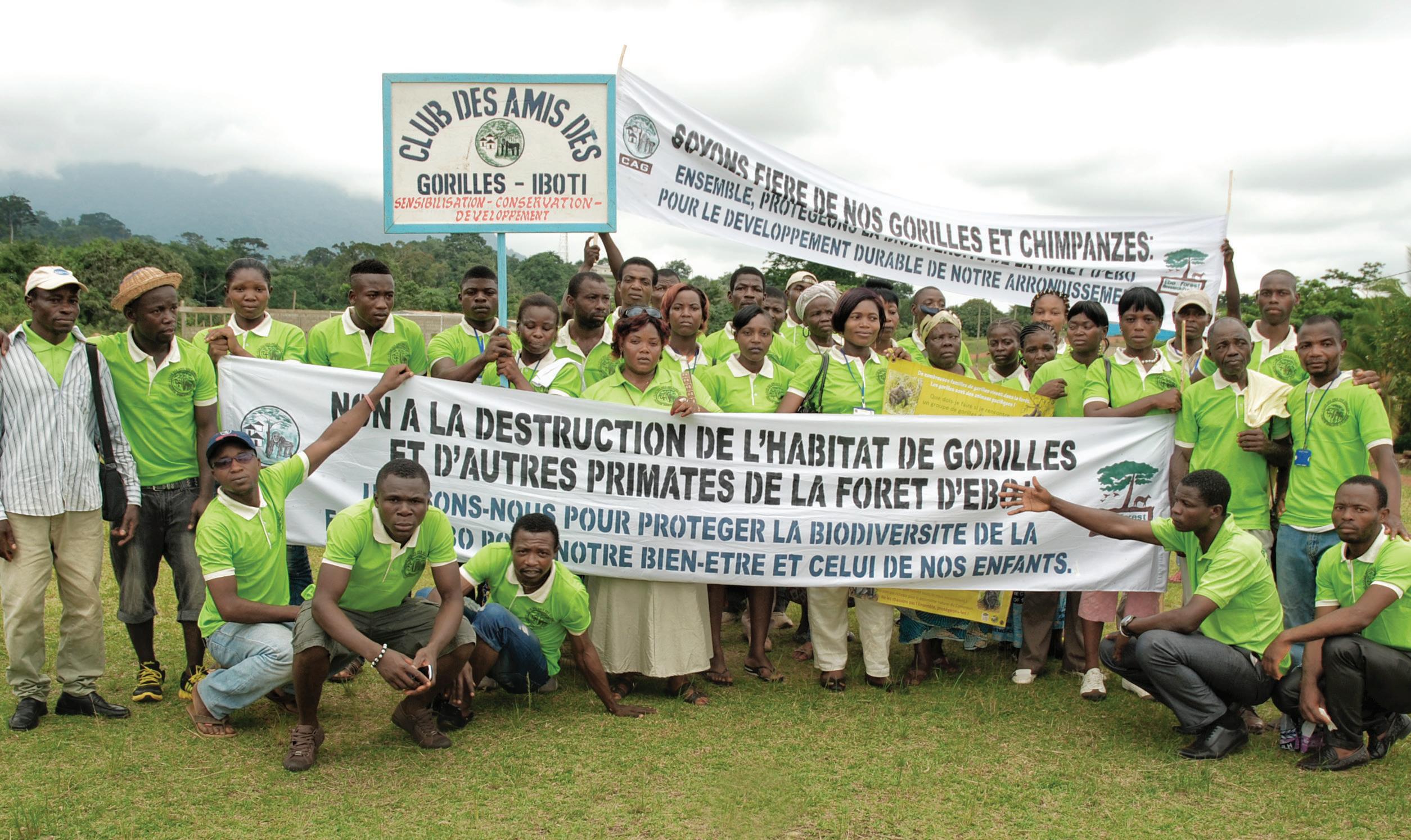 Club des Amis des Gorilles of Iboti village during Cameroon national day celebrations (May 20) at Yingui (administrative headquarters). They spread their message via parades with conservation messages on posters, banners, t-shirts, and songs emphasizing the need to protect the unique great apes of the Ebo forest and their habitat.
