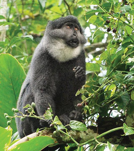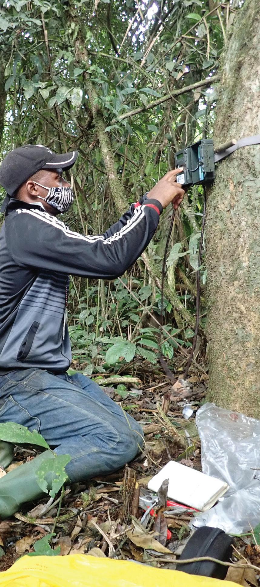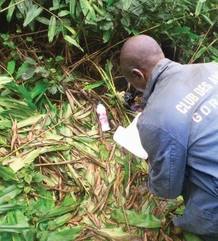 Opposite page, top row, left to right: Two chimpanzees in the Ebo forest feed on fruit; The administrator of Yingui subdivision (Michael Nkenemo, in brown) with security and wildlife officials inaugurate Club des Amis des Gorilles in Lognanga village in 2013. Second row: Iboti community members learn how to operate a cassava grinding mill, which is aimed at increasing the production of cassavaderived products that are sought after in urban centers, thus increasing household income in this CAG village; Preuss’s monkey in the Ebo forest; EFRP research assistant Rodel Vouffo servicing a trail camera in the gorilla habitat, Ebo forest. Bottom row, left to right: red-eared guenon in the Ebo forest; gorilla nest in the Ebo forest; CAG team member collecting data about the nest.