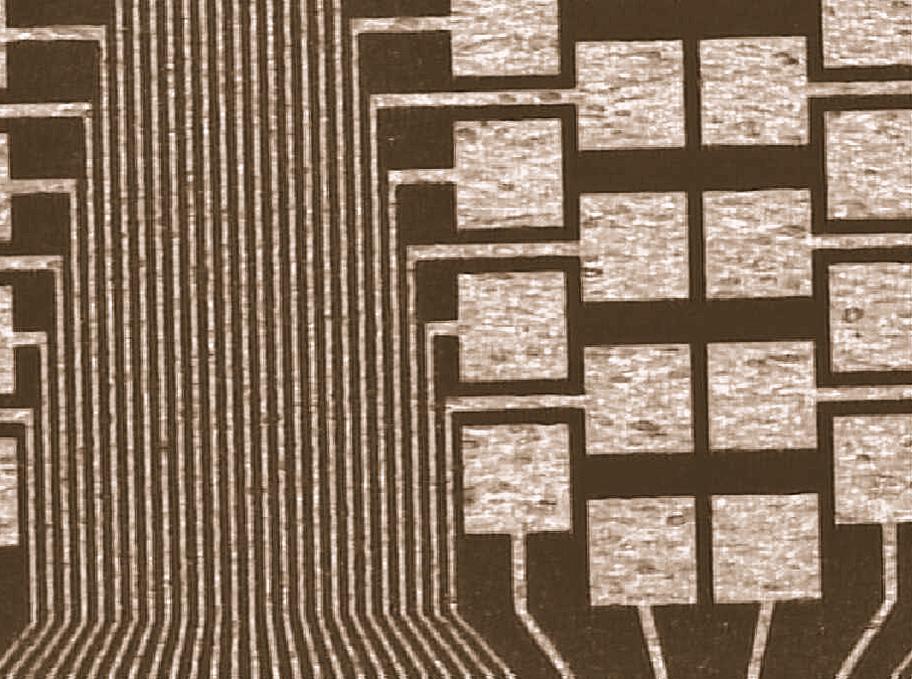 Mönsterkort enligt kundspecifikation med ledarmönster etsat med Obducats EFAACE metod. De fyrkantiga ytorna är 100 mikrometer i sida.