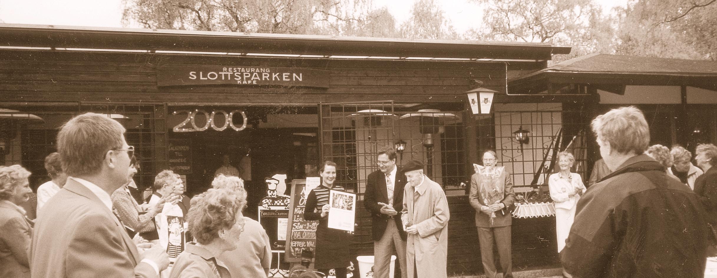 1: a Maj 2000 firades i strålande Majsolsken Hedersmedlem Gustaf Holmström, -28G, har överlämnat en minnestavla till Brasseri Slottsparkens Matilda som tack för alla år under 1900-talet som man förtjänstfullt serverat förbundets 1:a majfirande.