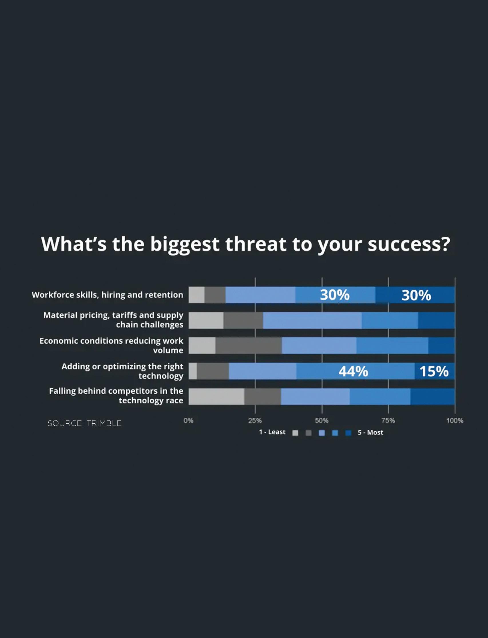 According to findings from a 2025 survey completed by Trimble, contractors have identified workforce skills, hiring and retention as the most significant threat to success in 2026. Technology ranked closely behind, particularly noting the ability to adopt or optimize the right solutions.