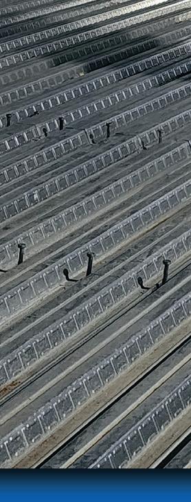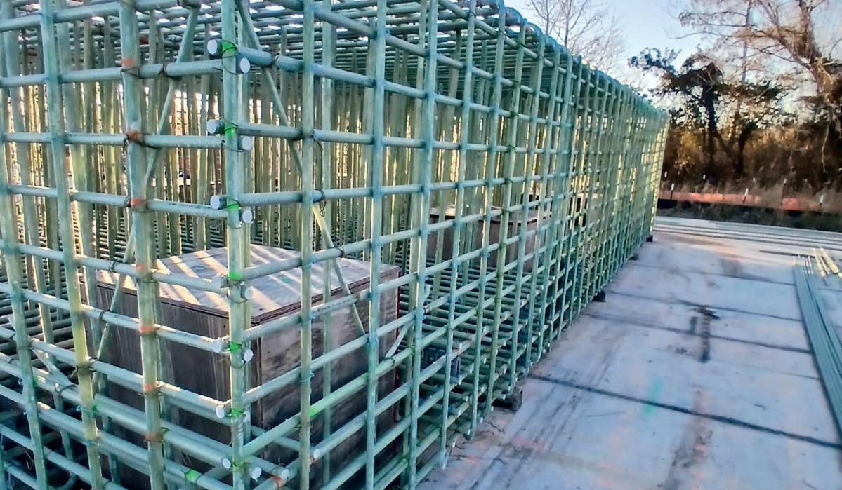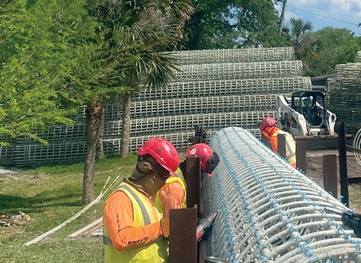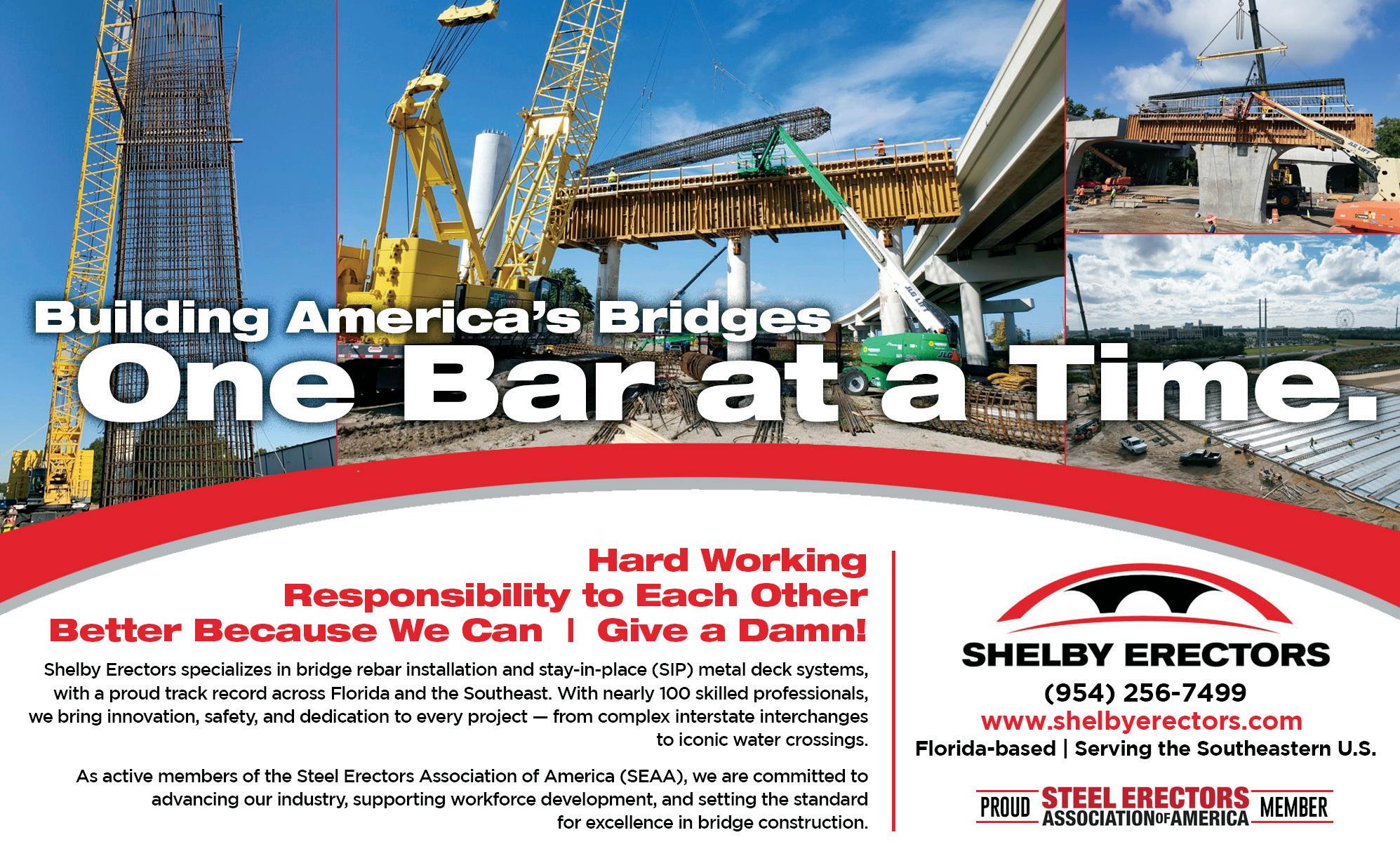 On the Cover: Shelby Erectors served as the Glass Fiber Reinforced Polymer (GFRP) reinforcement installer for the Florida Department of Transportation’s A1A Secant Wall Project in Flagler Beach, Florida. To meet the production schedule, Shelby Erectors developed a custom rebar rack system. Here, rodbusters tie GFRP cages in the rebar racks with about 300 completed cages stacked in the background.